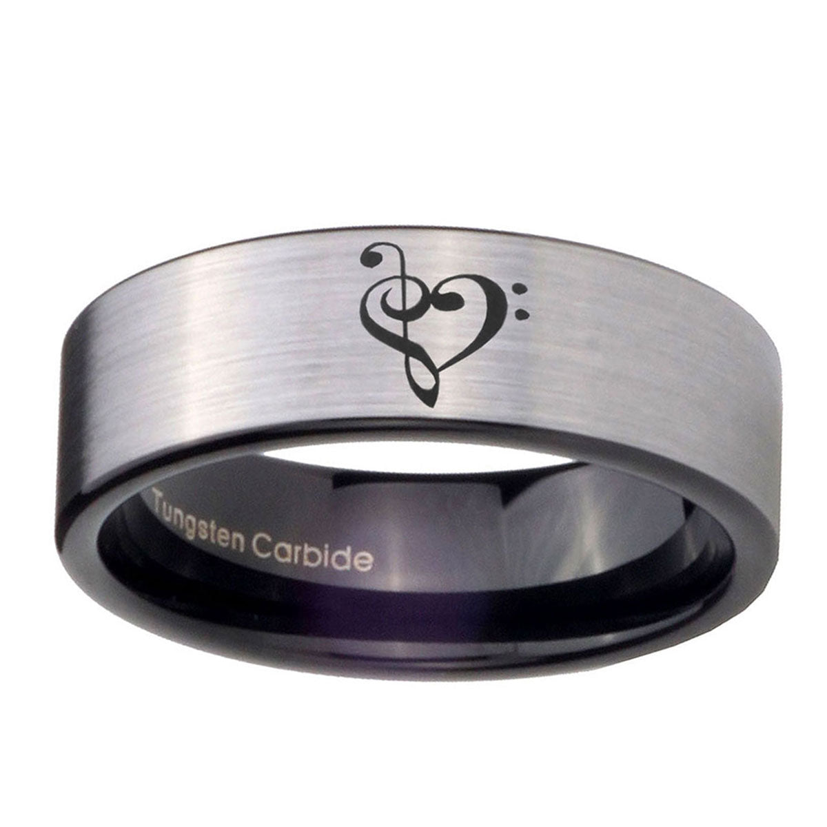 6, 8mm Music & Heart Pipe Cut Brushed Silver Tungsten Carbide Men's Wedding Ring