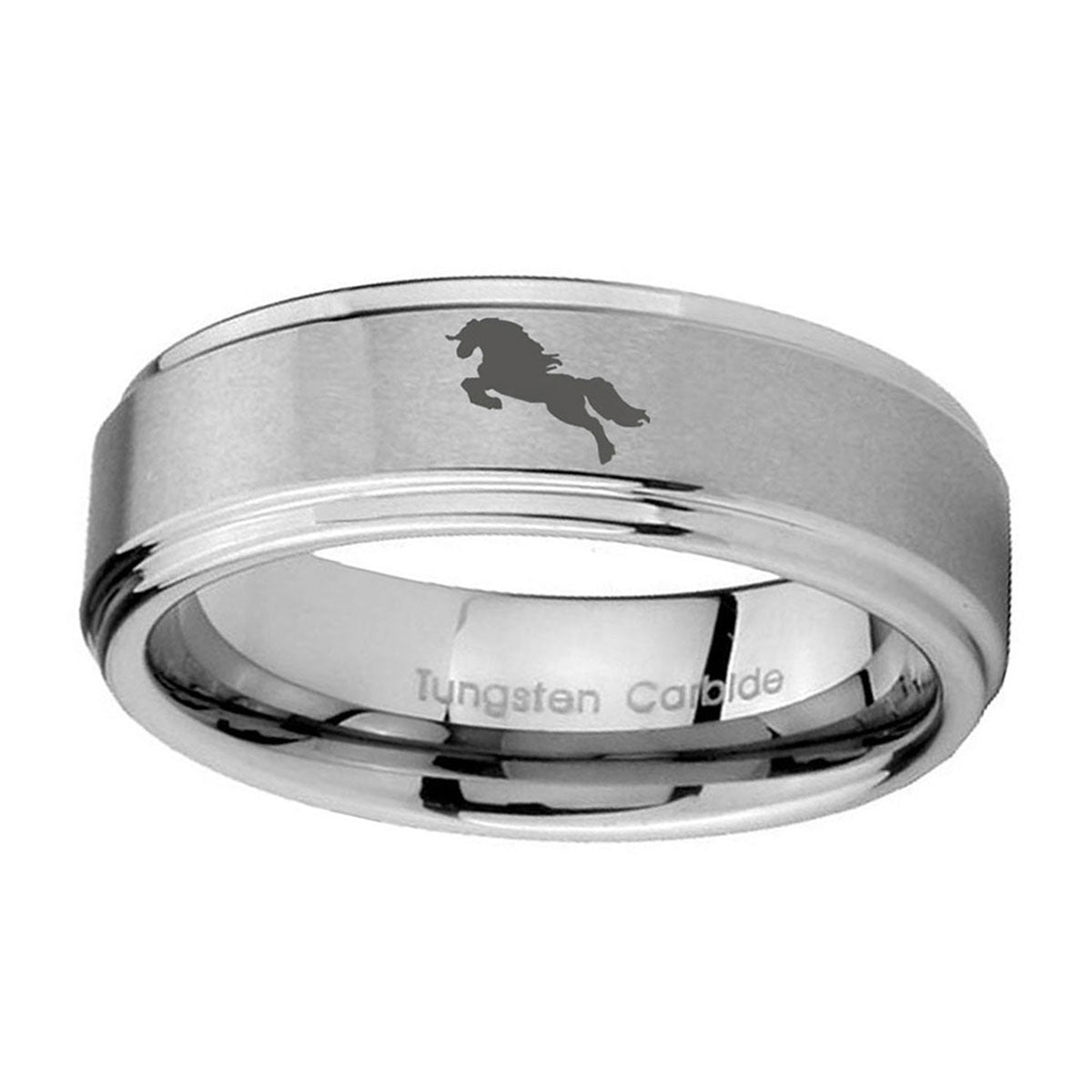 Celebrate milestones with the 10mm Horse Step Edges Brushed Tungsten Carbide Anniversary Ring. This brushed tungsten ring with Horse design and step edges is perfect for anniversaries.
