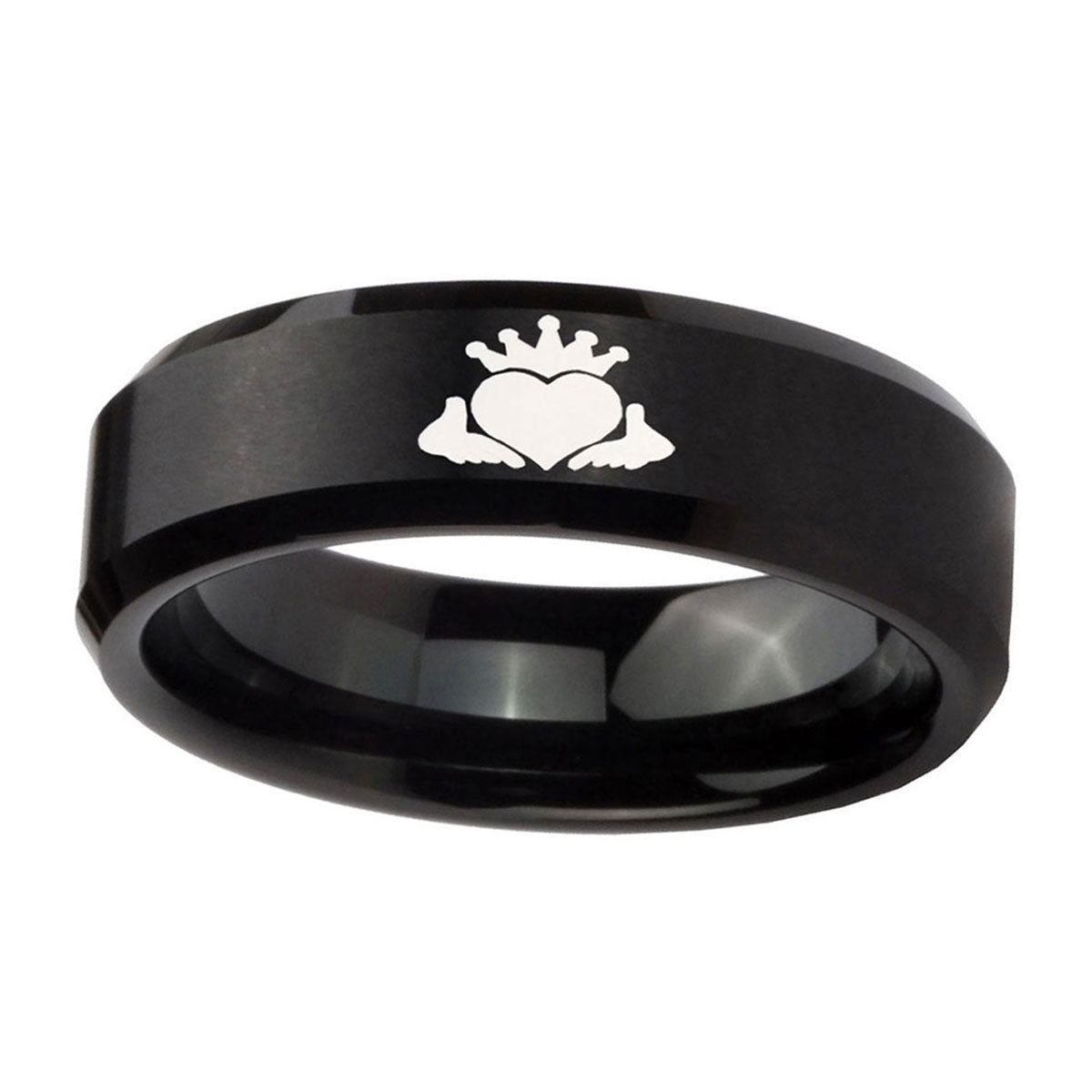 10mm Claddagh Design Beveled Edges Brush Black Tungsten Carbide Promise Ring