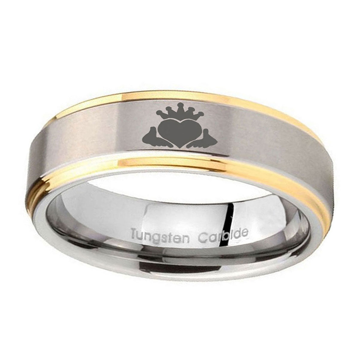 10mm Claddagh Design Step Edges Gold 2 Tone Tungsten Men's Engagement Ring
