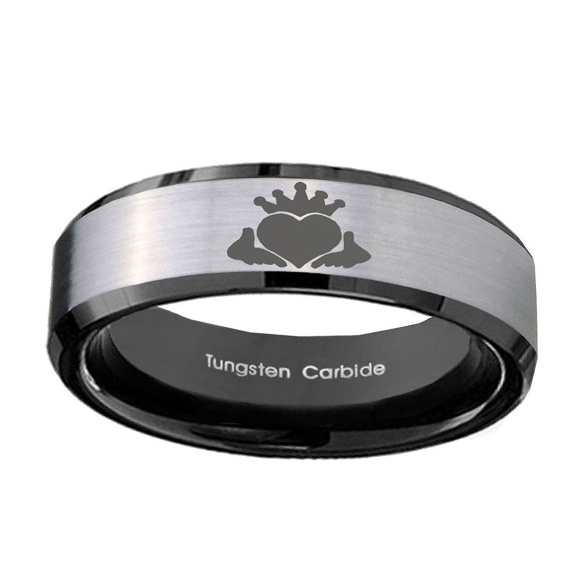 10mm Claddagh Design Beveled Brushed Silver Black Tungsten Men's Engagement Ring