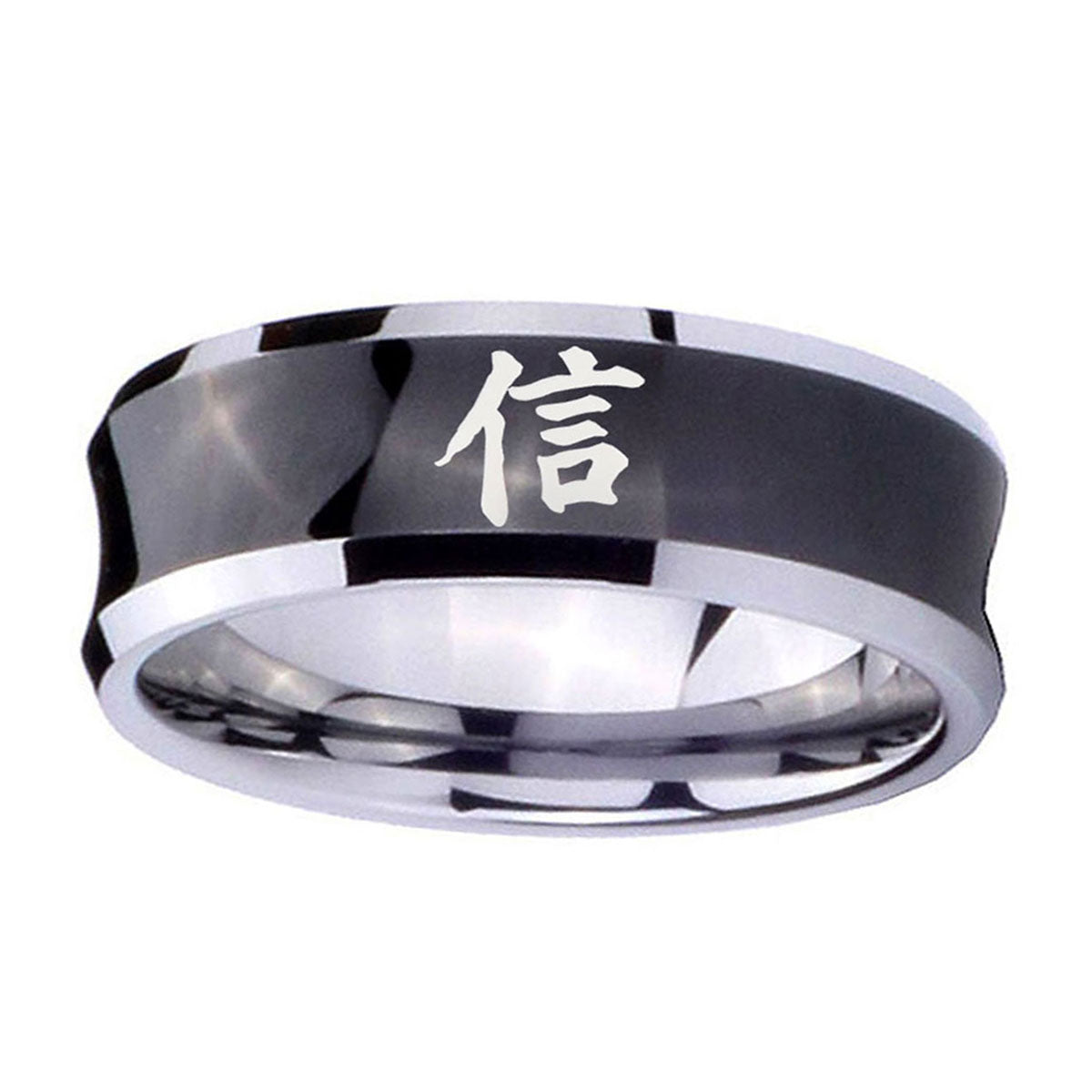 Make a promise with the 10mm Kanji Faith Concave Black Tungsten Carbide Promise Ring. This concave black tungsten ring with Kanji Faith design is ideal for commitments.