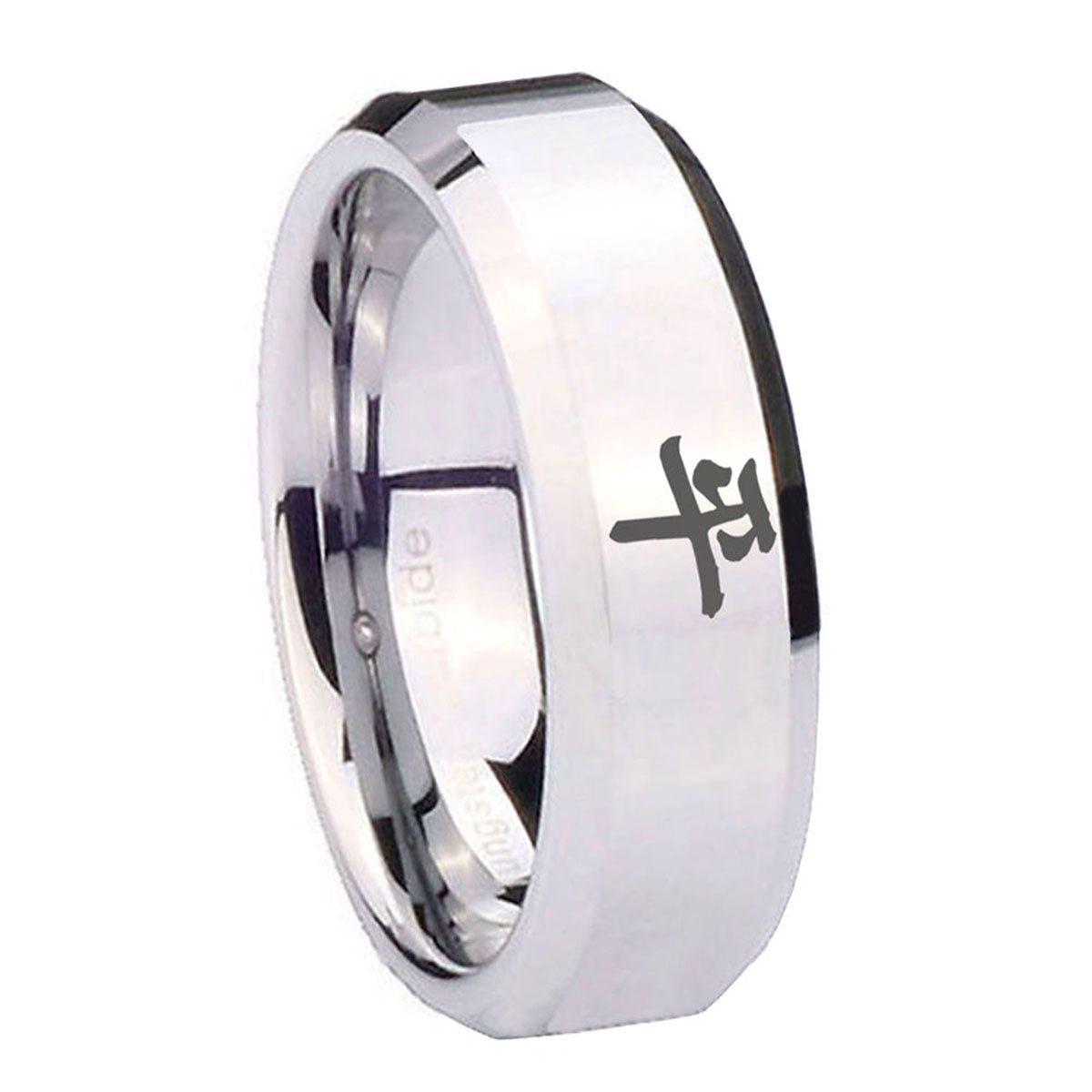 Customize the 10mm Kanji Peace Beveled Edges Silver Tungsten Carbide Custom Mens Ring. This silver tungsten ring with Kanji Peace design is perfect for personalization.