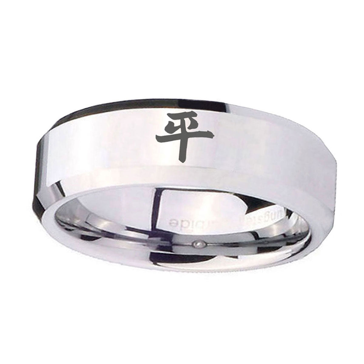10mm Kanji Peace Beveled Edges Silver Tungsten Carbide Custom Mens Ring
