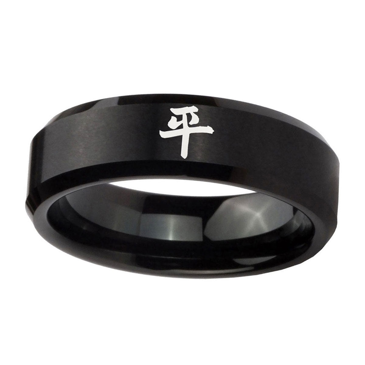 Introuding 5, 8mm Kanji Peace Beveled Edges Brush Black Tungsten Carbide Wedding Band Mens . Offer in both 5mm and 8mm band width brushed black plated fnished from size 4 to 14