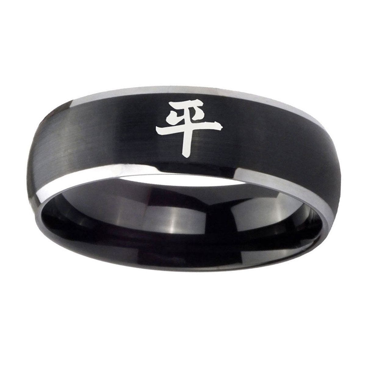 Introuding 5, 8mm Kanji Peace Dome Brushed Black 2 Tone Tungsten Carbide Mens Engagement Ring . Offer in both 5mm and 8mm band width brushed black plated fnished from size 4 to 14