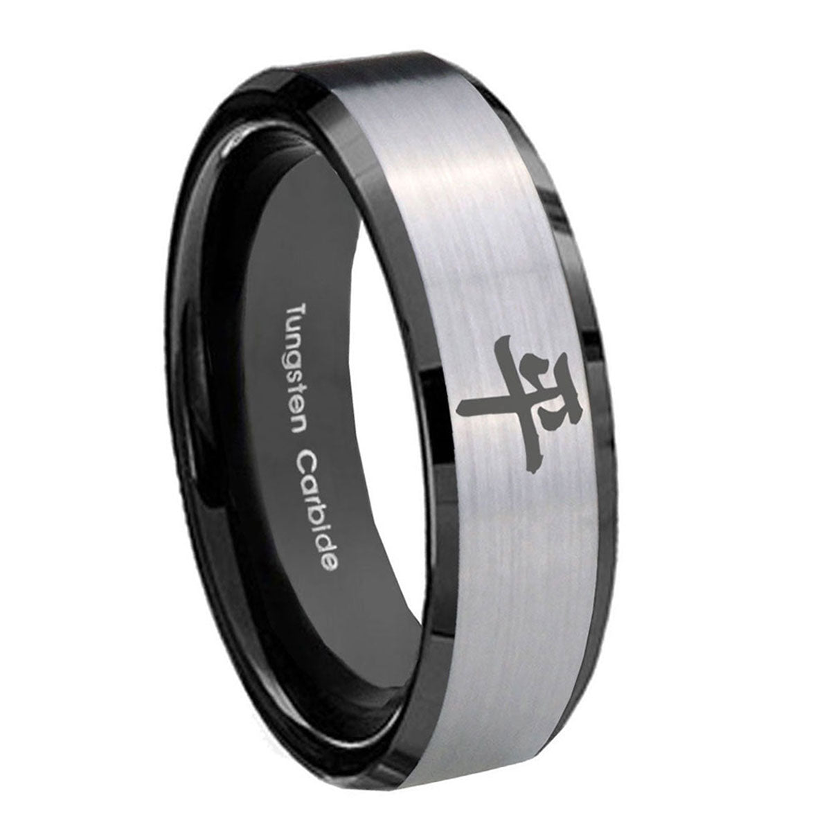 10mm Kanji Peace Beveled Edges Brushed Silver Black Tungsten Mens Promise Ring