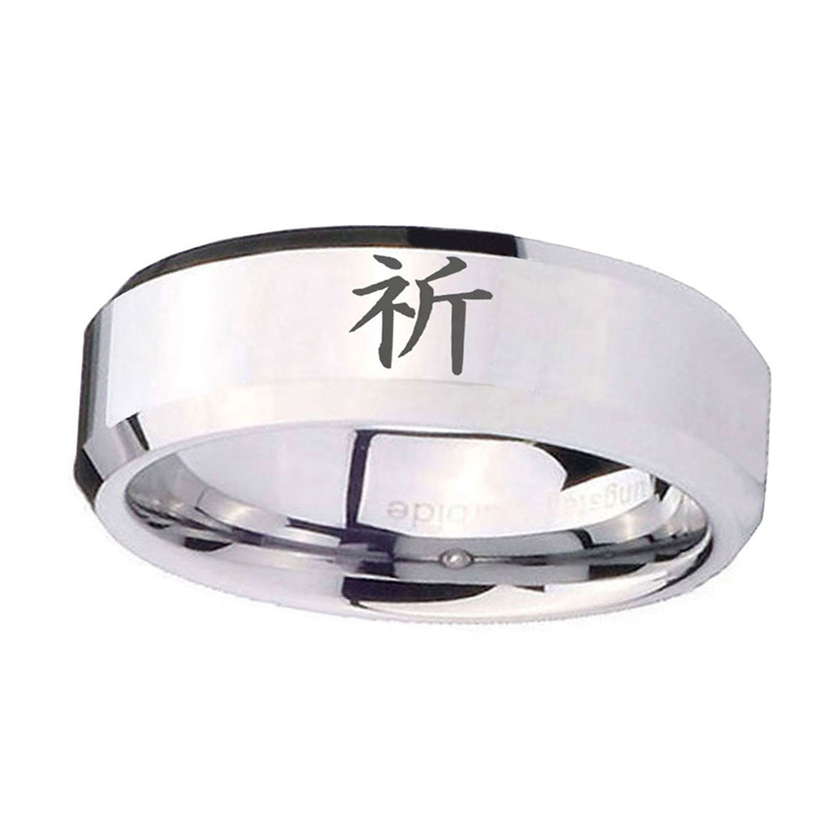 Style the 10mm Kanji Prayer Beveled Edges Silver Tungsten Carbide Rings for Men. This silver tungsten ring with Kanji Prayer design is perfect for men.