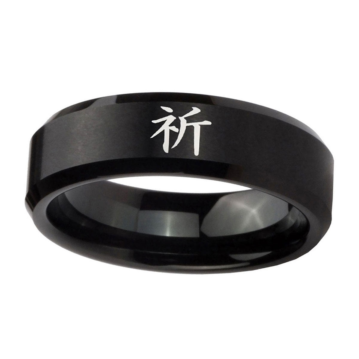 Celebrate with the 10mm Kanji Prayer Beveled Edges Brush Black Tungsten Carbide Wedding Bands Ring. This brushed black tungsten ring with Kanji Prayer design is perfect for weddings.