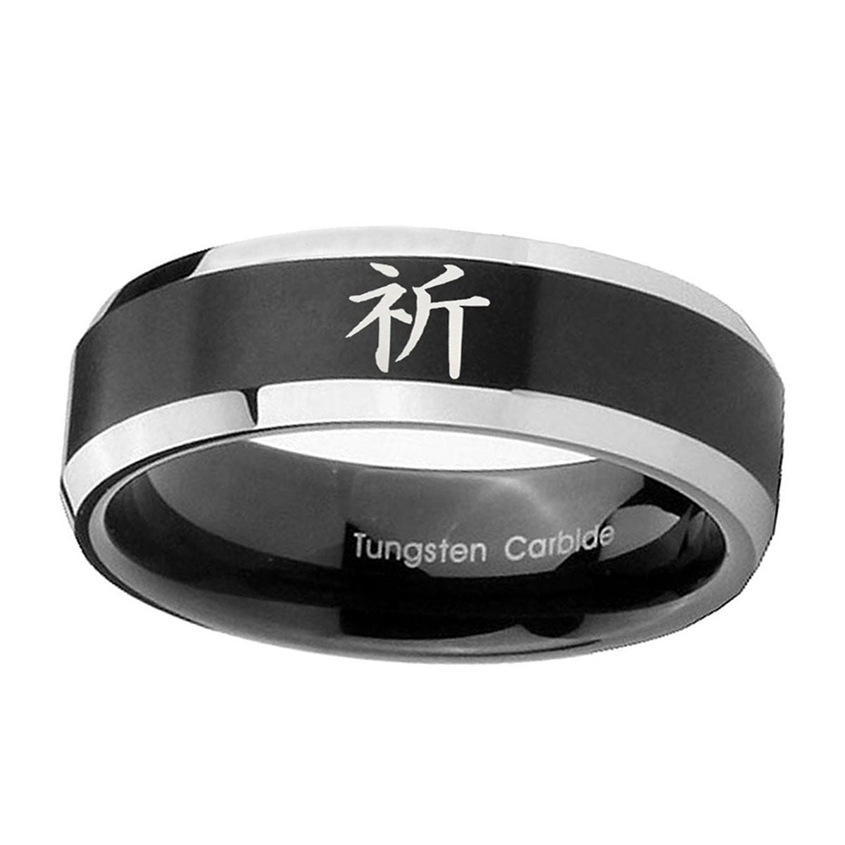 Customize the 10mm Kanji Prayer Beveled Edges Brush Black 2 Tone Tungsten Custom Mens Ring. This brushed black and 2-tone tungsten ring with Kanji Prayer design is perfect for personalization.