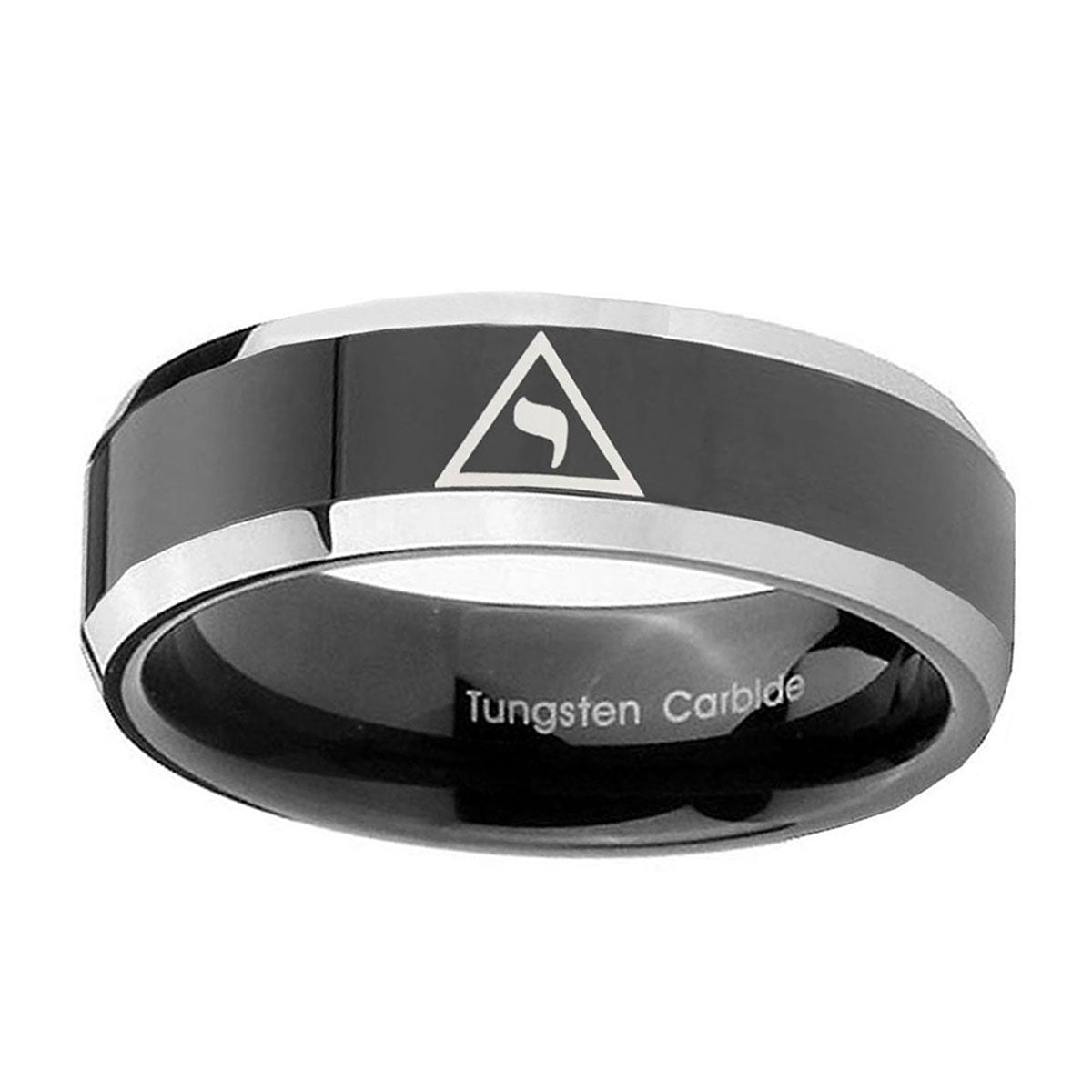 Style the 10mm Masonic Yod Beveled Edges Glossy Black 2 Tone Tungsten Rings for Men. This glossy black and 2-tone tungsten ring with Masonic Yod design is perfect for men.