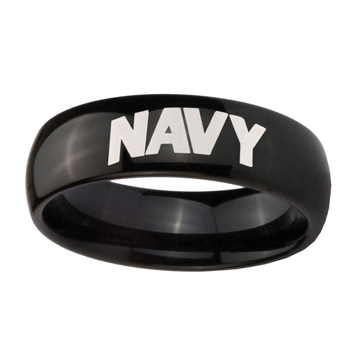 Introuding 5, 8mm Navy Dome Black Tungsten Carbide Mens Anniversary Ring . Offer in both 5mm and 8mm band width polished black plated fnished from size 4 to 14