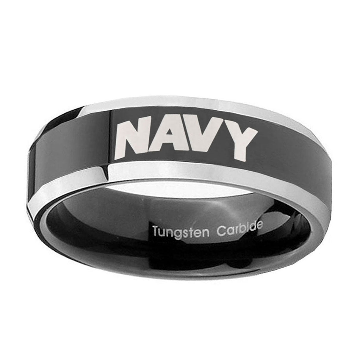 Introuding 5, 8mm Navy Beveled Edges Glossy Black 2 Tone Tungsten Men's Engagement Ring . Offer in both 5mm and 8mm band width shiny black pated two tone finished from size 4 to 14