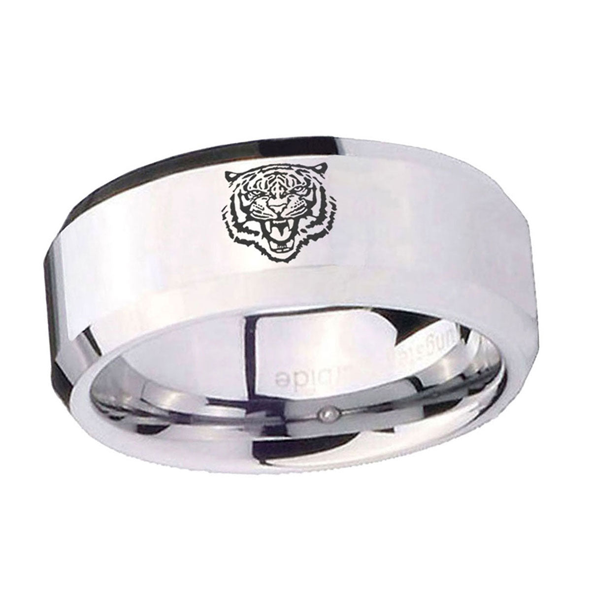 10mm Lion Beveled Edges Silver Tungsten Carbide Mens Ring Engraved