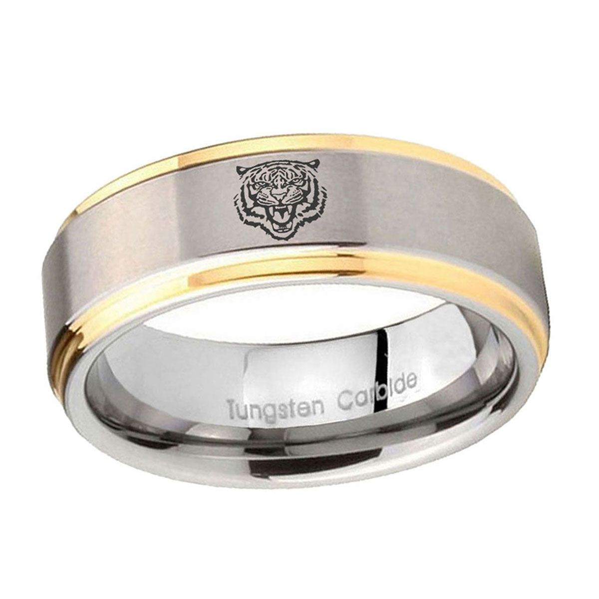 Celebrate with the 10mm Lion Step Edges Gold 2 Tone Tungsten Carbide Bands Ring. This gold and 2-tone tungsten ring with Lion design is perfect for weddings.