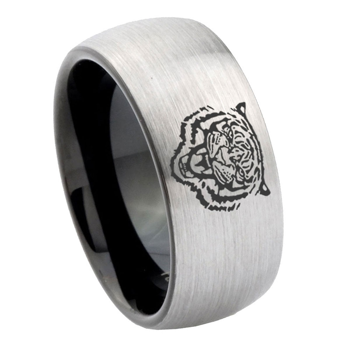 Propose with the 10mm Lion Dome Tungsten Carbide Silver Black Engagement Ring. This silver and black tungsten dome ring with Lion design is ideal for engagements.