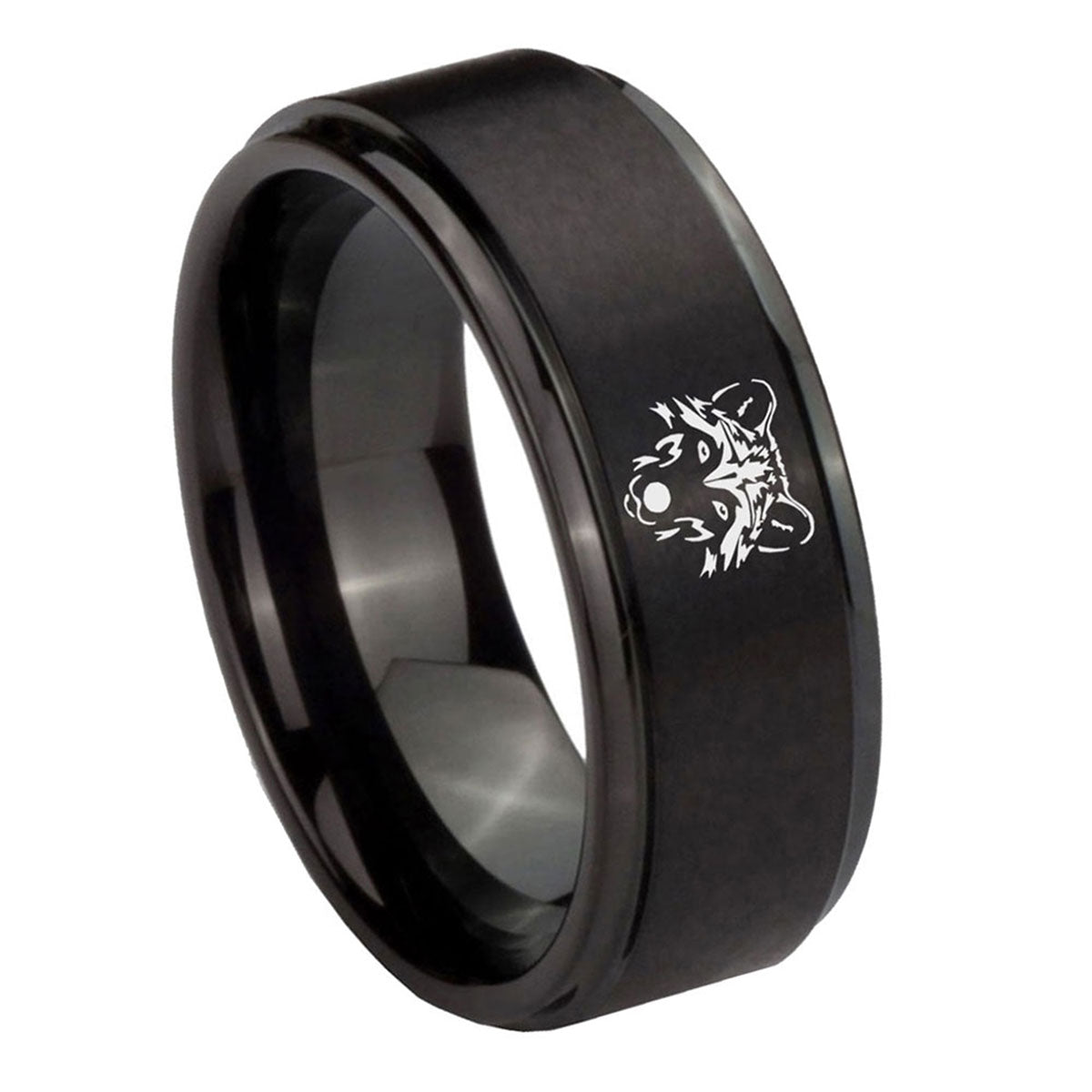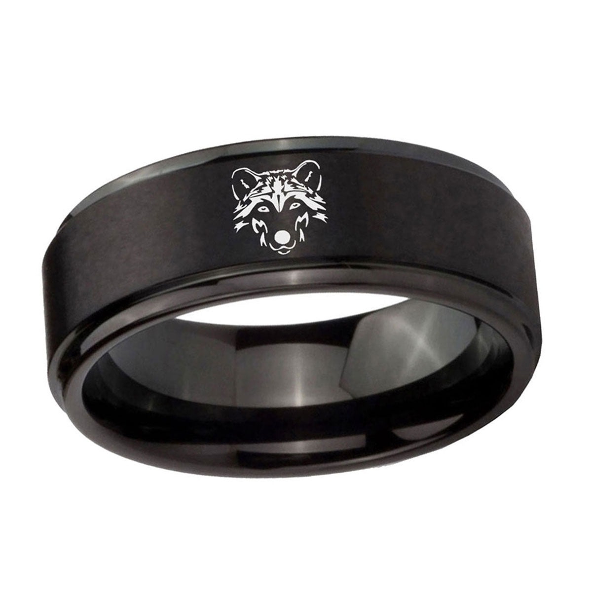 Make a promise with the 10mm Wolf Step Edges Brush Black Tungsten Men's Promise Rings. This brushed black ring with step edges and Wolf design is ideal for commitments.