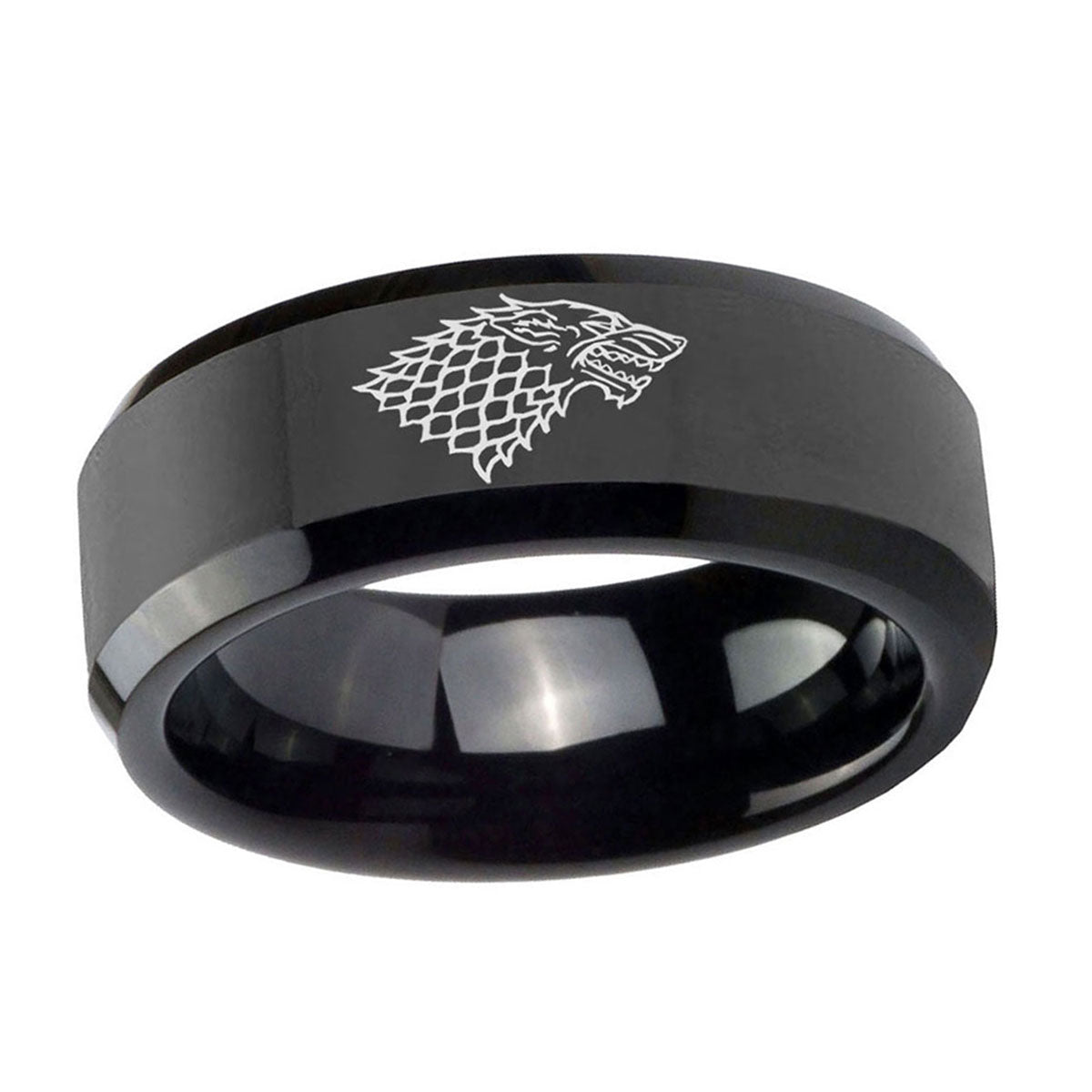 Celebrate with the 10mm Game Of Thrones House Stark Direwolf Beveled Edges Black Tungsten Carbide Men's Wedding Band. This black tungsten ring with Direwolf design is perfect for weddings.
