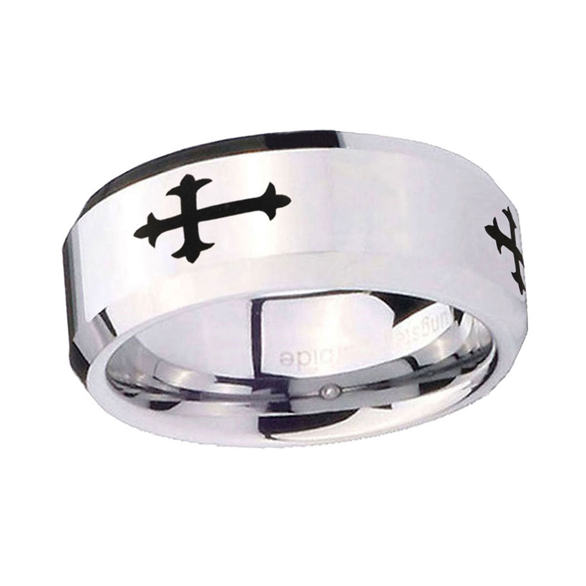 10mm Christian Cross Religious Beveled Edges Silver Tungsten Carbide Mens Ring Engraved