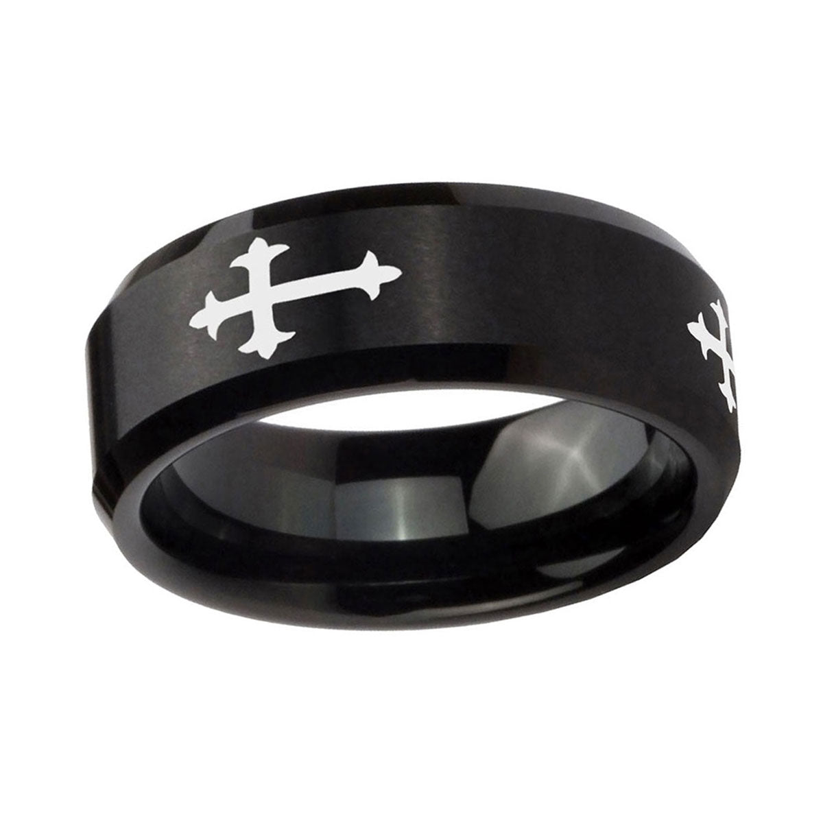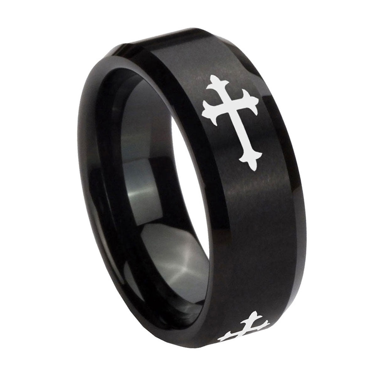 Propose with the 10mm Christian Cross Religious Beveled Edges Brush Black Tungsten Men's Engagement Ring. This brushed black tungsten ring with Christian cross religious design is perfect for engagements.