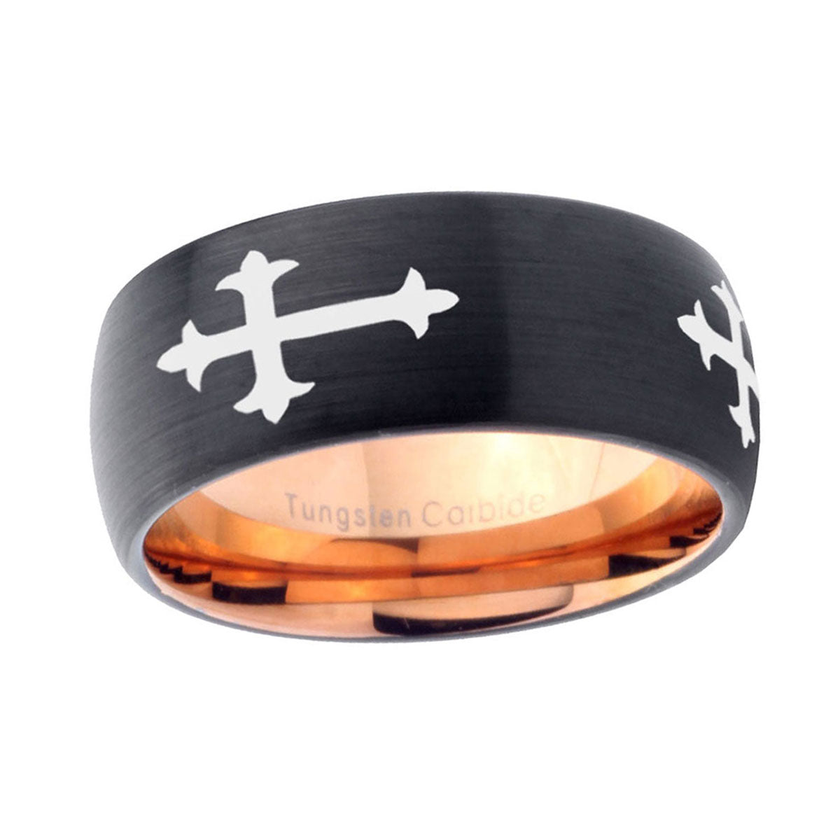 Introuding 5, 8mm Christian Cross Religious Dome Tungsten Carbide Rose Gold Anniversary Ring . Offer in both 5mm and 8mm band width black and rose gold plated finished from size 4 to 14