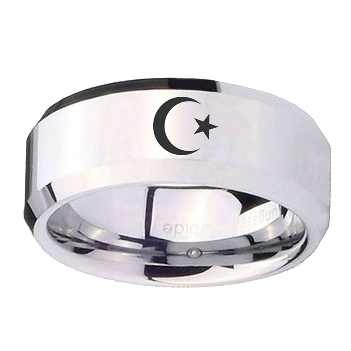 Personalize the 10mm Crescent Moon Stars Beveled Edges Silver Tungsten Carbide Mens Ring Engraved. This silver tungsten ring with Crescent Moon Stars design is perfect for custom engravings.