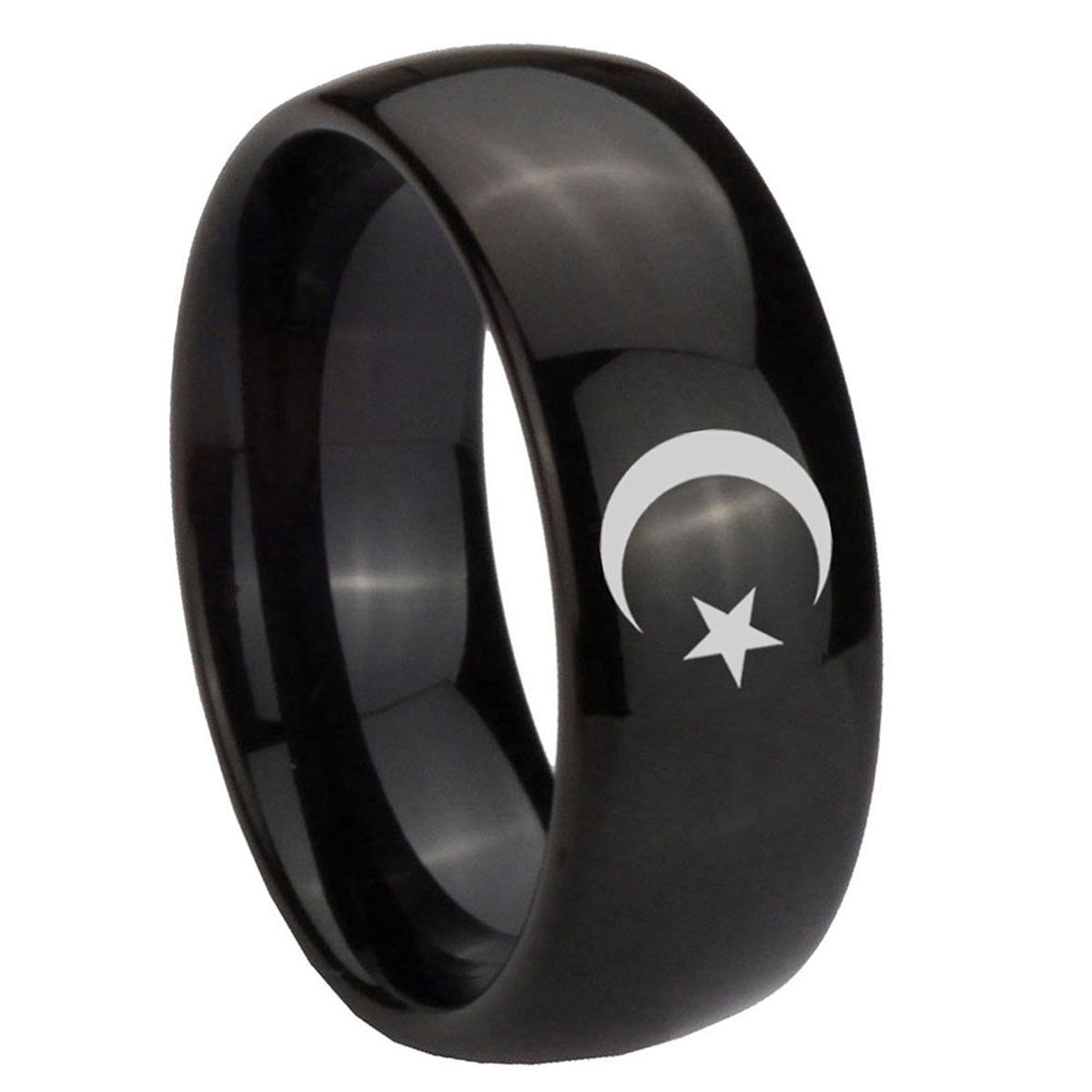 Introuding 5, 8mm Crescent Moon Stars Dome Black Tungsten Carbide Mens Wedding Band . Offer in both 5mm and 8mm band width polished black plated fnished from size 4 to 14