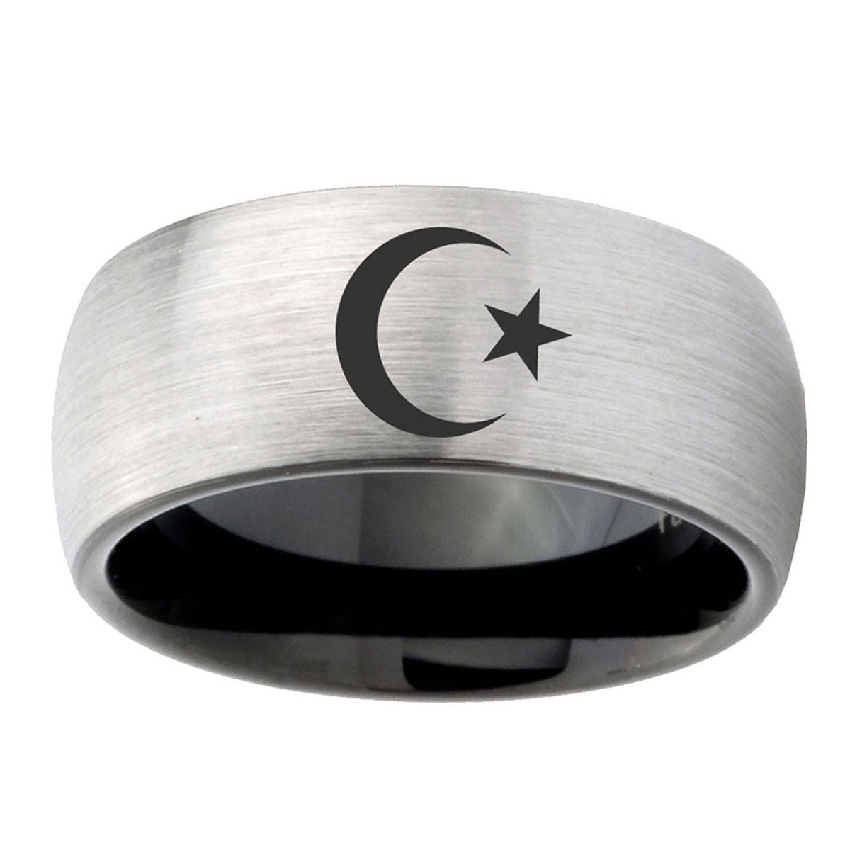 Propose with the 10mm Crescent Moon Stars Dome Tungsten Carbide Silver Black Engagement Ring. This silver and black tungsten dome ring with Crescent Moon Stars design is ideal for engagements.