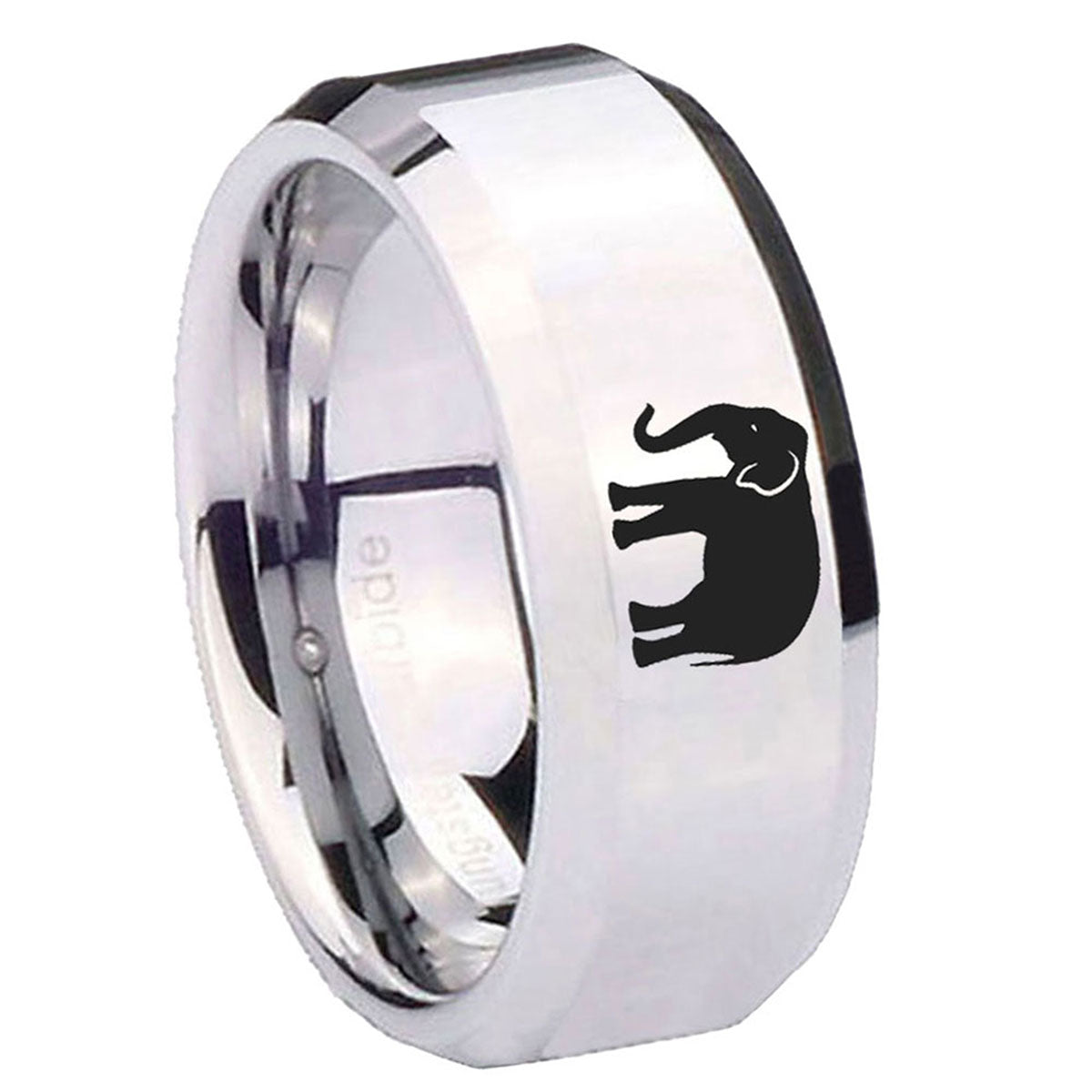 10mm Elephant Beveled Edges Silver Tungsten Carbide Mens Ring Engraved