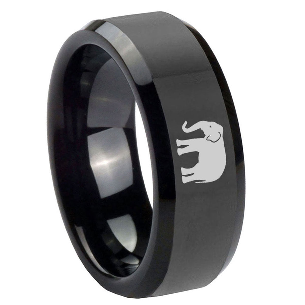Introuding 5, 8mm Elephant Beveled Edges Black Tungsten Carbide Mens Engagement Band . Offer in both 5mm and 8mm band width polished black plated fnished from size 4 to 14