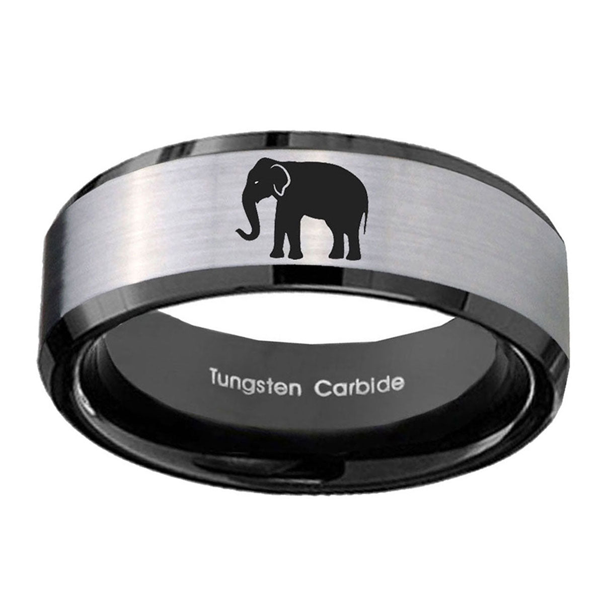 Customize the 10mm Elephant Beveled Brushed Silver Black Tungsten Custom Mens Ring. This silver and black tungsten ring with Elephant design is ideal for personalization.