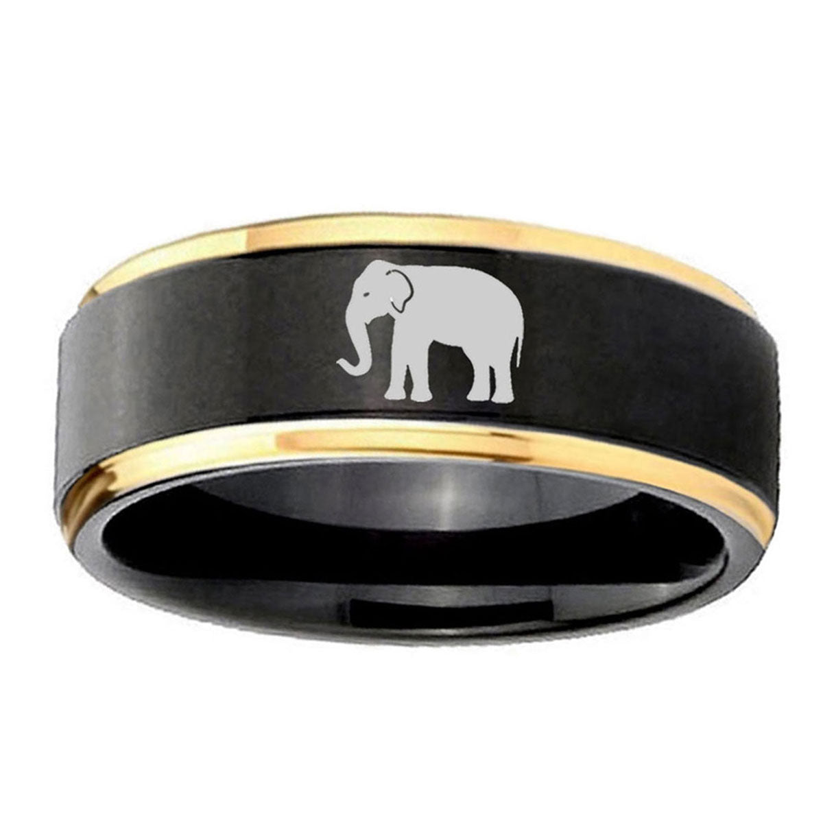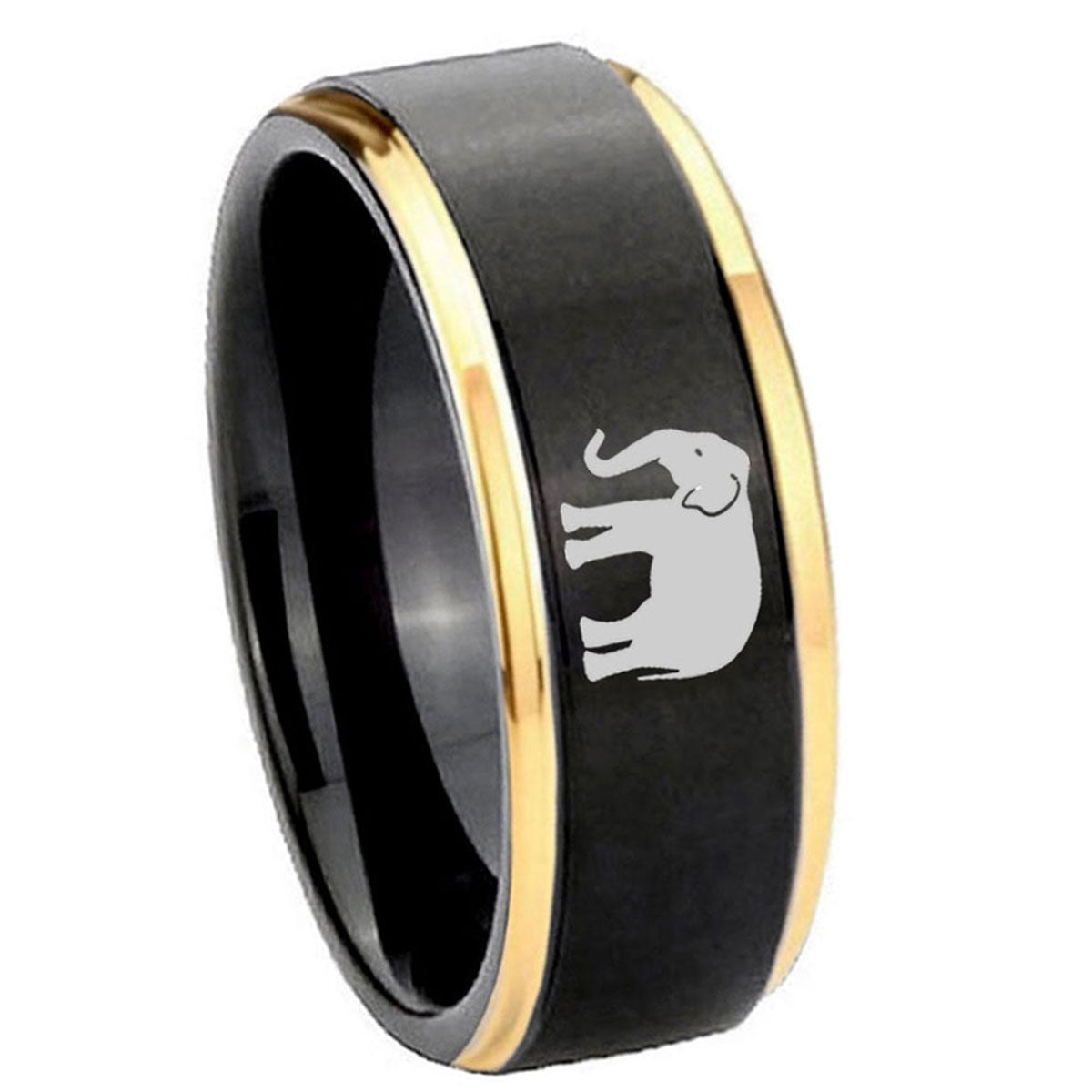 Introuding 6, 8mm Elephant Gold Step Edges Tungsten Carbide Mens Wedding Ring . Offer in both 5mm and 8mm band width black and gold plated finished from size 4 to 14