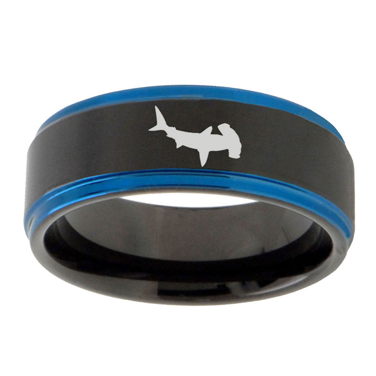 Make a promise with the 10mm Hammerhead Shark Blue Step Edges Brushed Tungsten Carbide Mens Promise Ring. This brushed blue tungsten ring with Hammerhead Shark design is perfect for commitments.