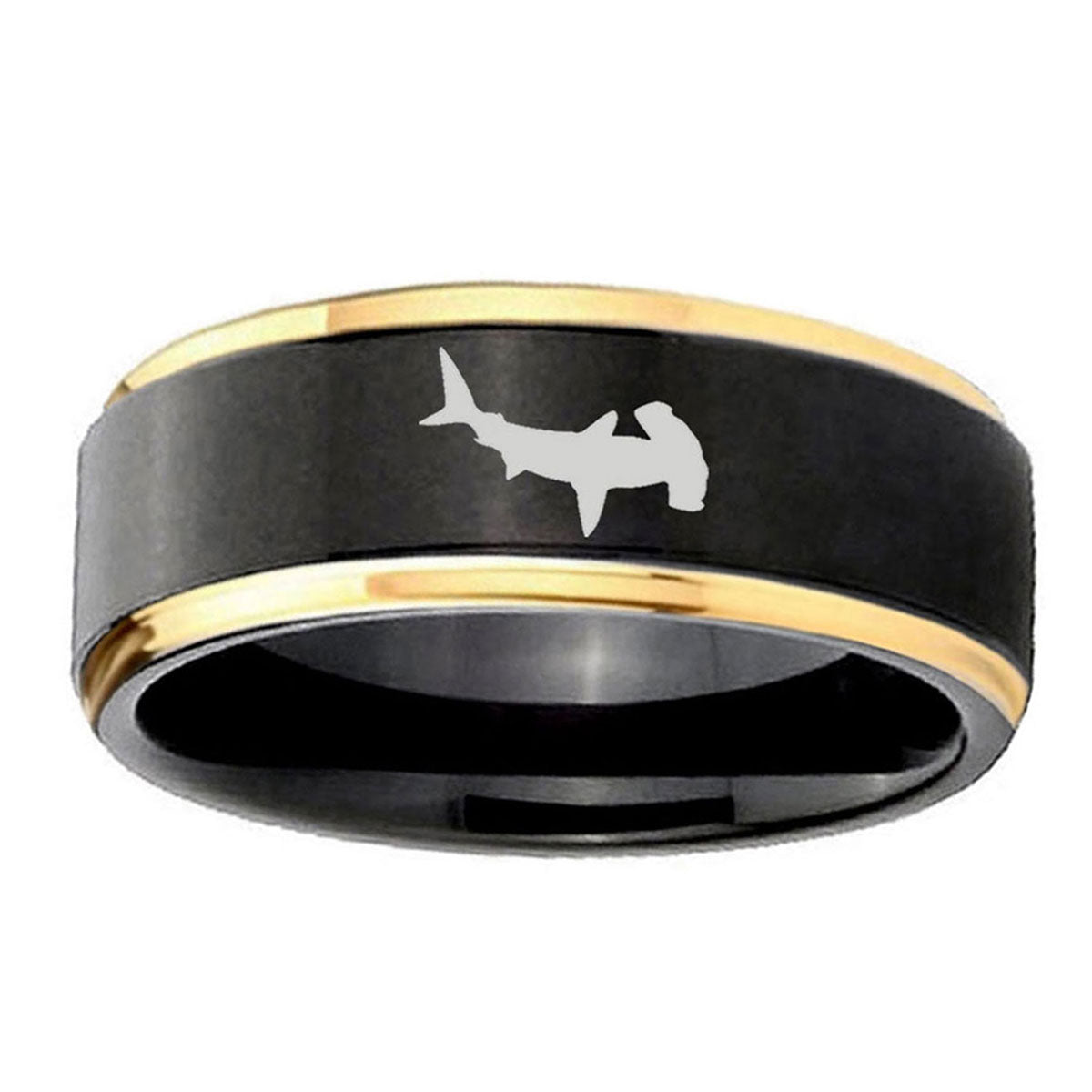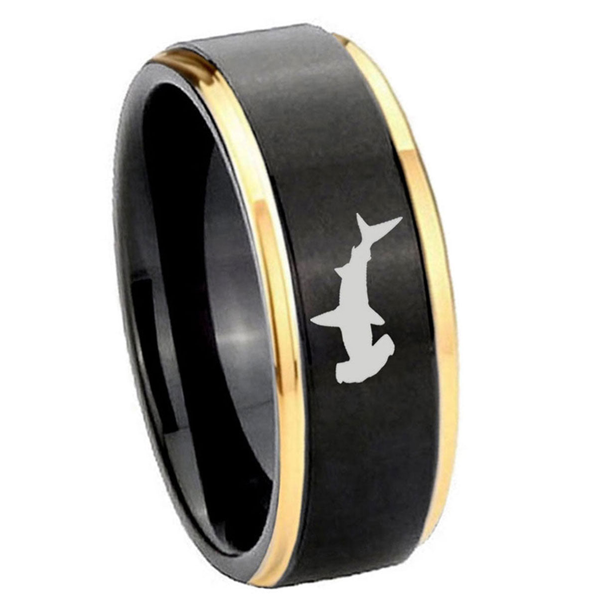 Introuding 6, 8mm Hammerhead Shark Gold Step Edges Tungsten Carbide Mens Wedding Ring . Offer in both 5mm and 8mm band width black and gold plated finished from size 4 to 14
