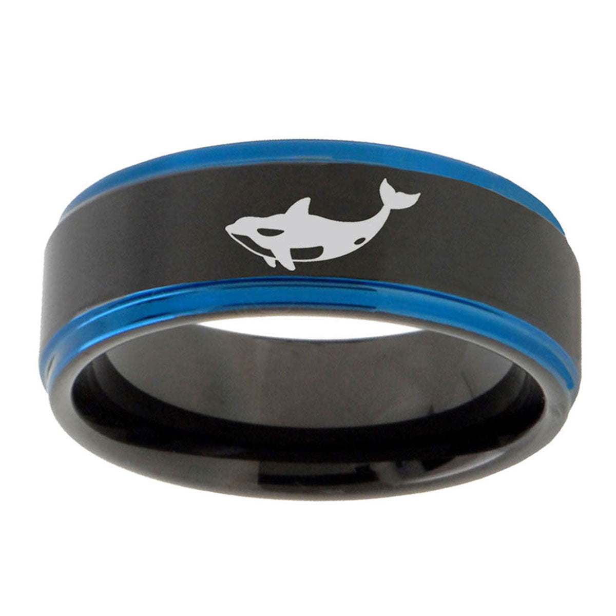 Make a promise with the 10mm Keller Whale Blue Step Edges Brushed Tungsten Carbide Mens Promise Ring. This brushed blue tungsten ring with Keller Whale design is ideal for commitments.