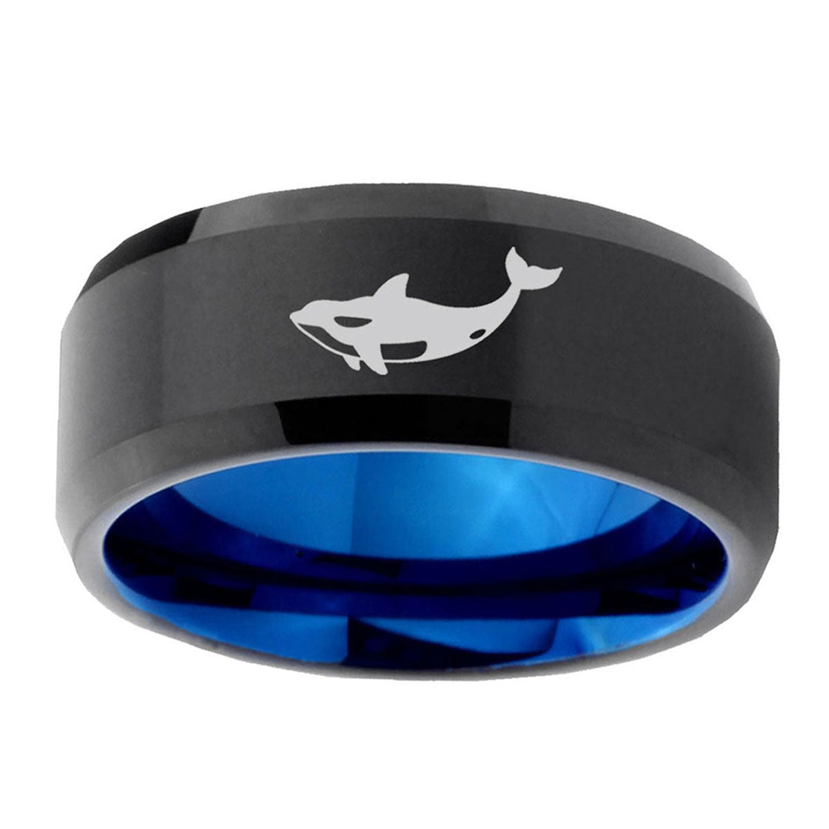 Celebrate ocean love with the 10mm Keller Whale Bevel Tungsten Carbide Blue Wedding Ring. This blue tungsten ring with Keller Whale design is perfect for weddings.