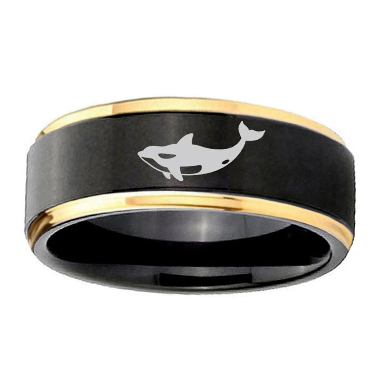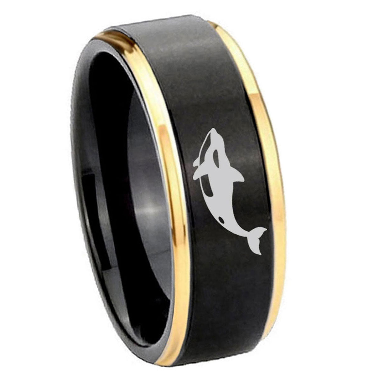 Introuding 6, 8mm Keller Whale Gold Step Edges Tungsten Carbide Mens Wedding Ring . Offer in both 5mm and 8mm band width black and gold plated finished from size 4 to 14
