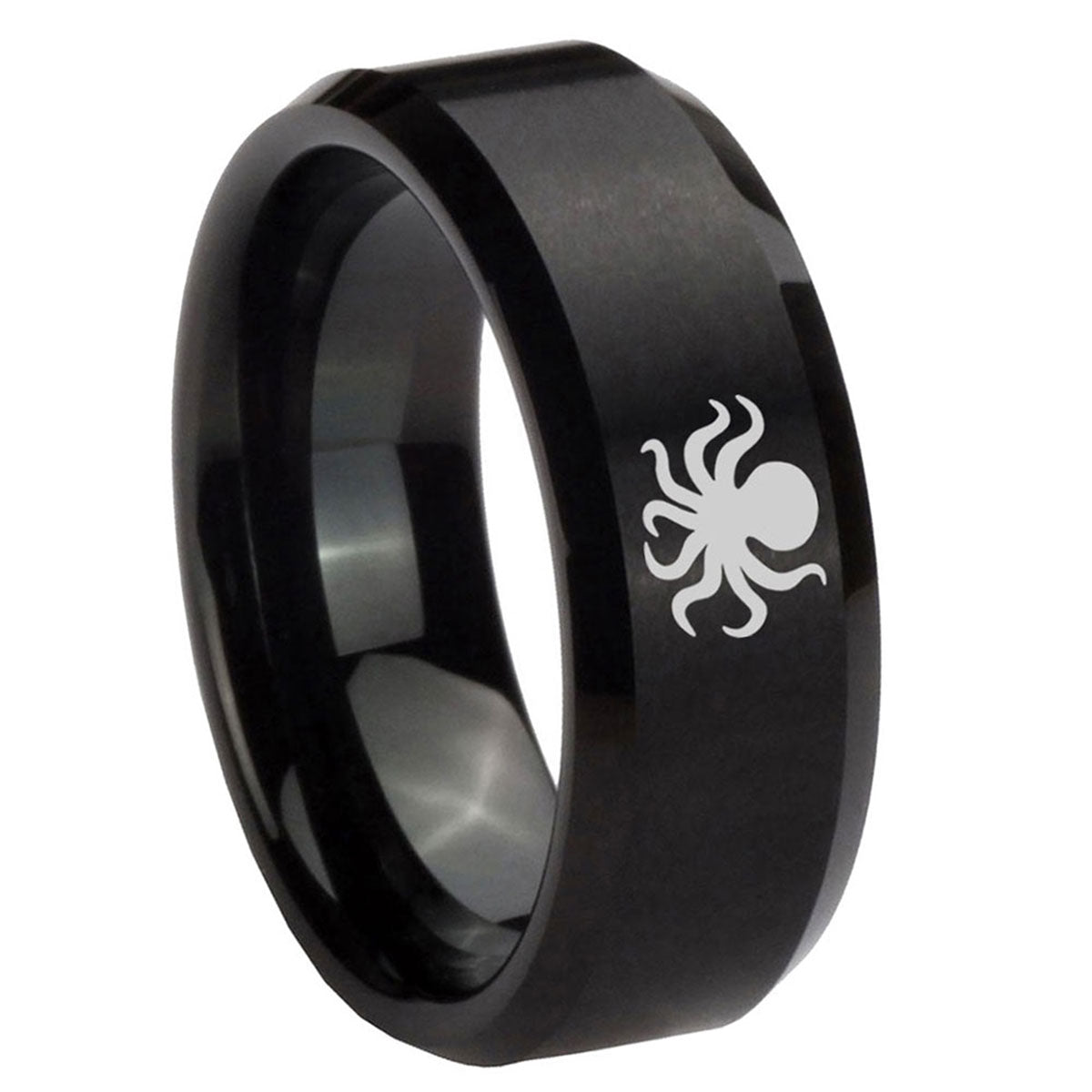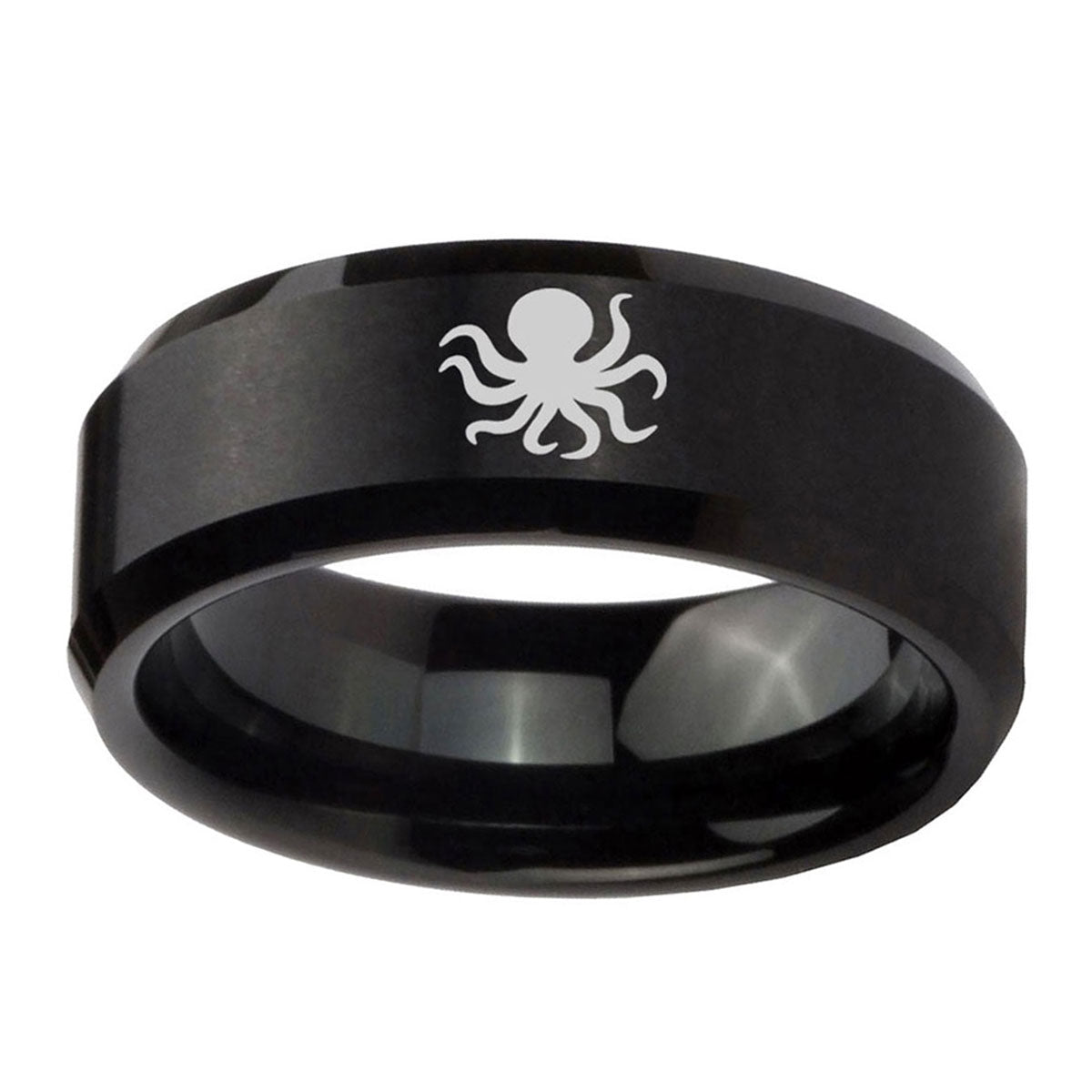 Propose with the 10mm Octopus Beveled Edges Brush Black Tungsten Men's Engagement Ring. This brushed black tungsten ring with Octopus design is ideal for engagements.