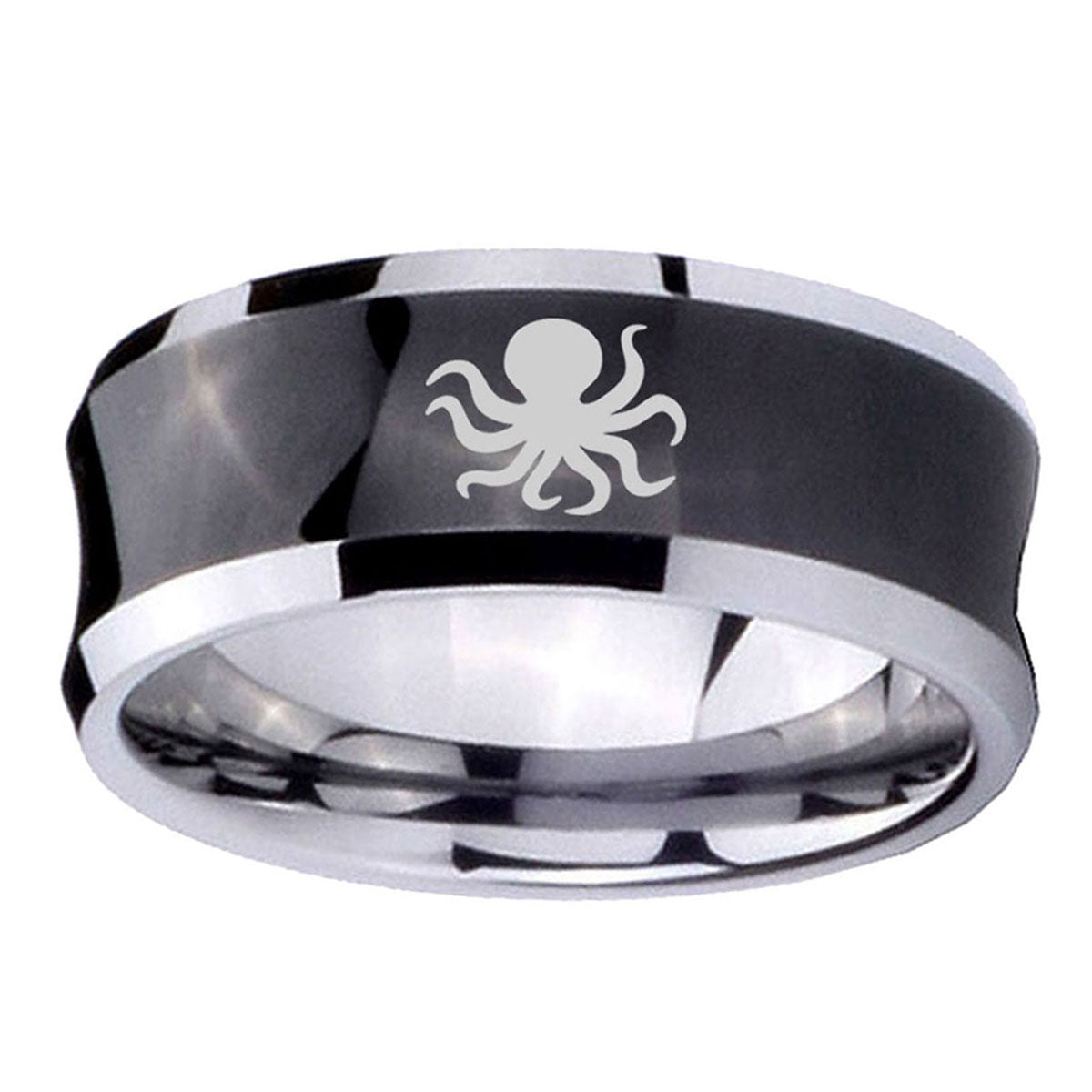 Propose with the 10mm Octopus Concave Black Tungsten Carbide Men's Engagement Band. This concave black tungsten ring with Octopus design is ideal for engagements.