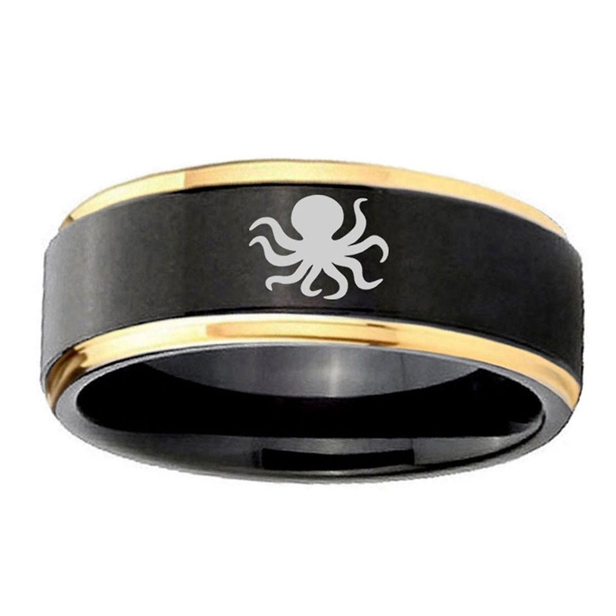 Introuding 6, 8mm Octopus Gold Step Edges Tungsten Carbide Mens Wedding Ring . Offer in both 5mm and 8mm band width black and gold plated finished from size 4 to 14