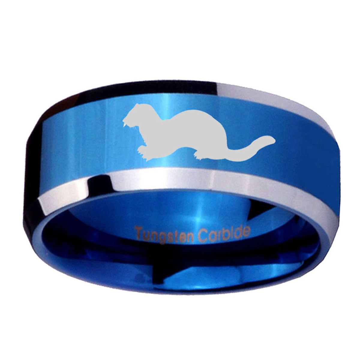 Propose with the 10mm Otter Beveled Edges Blue 2 Tone Tungsten Men's Engagement Ring. This blue and black 2-tone tungsten ring with Otter design is ideal for engagements.