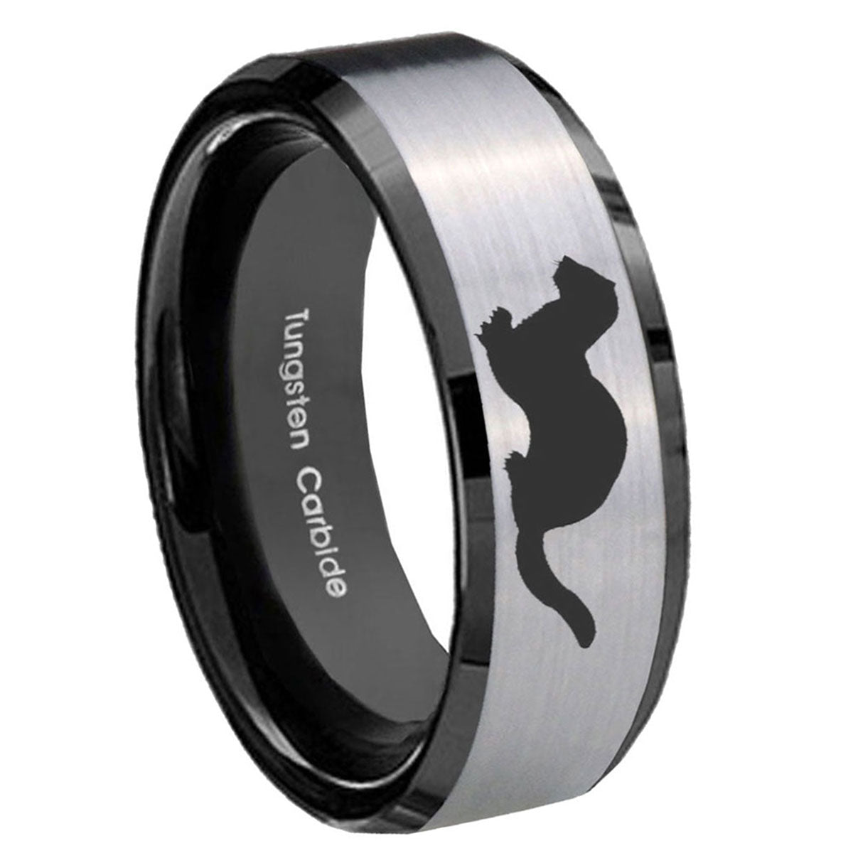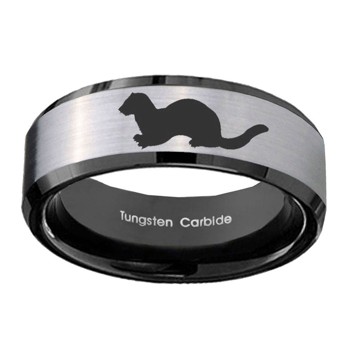 Customize the 10mm Otter Beveled Brushed Silver Black Tungsten Custom Mens Ring. This silver and black tungsten ring with Otter design is perfect for personalization.