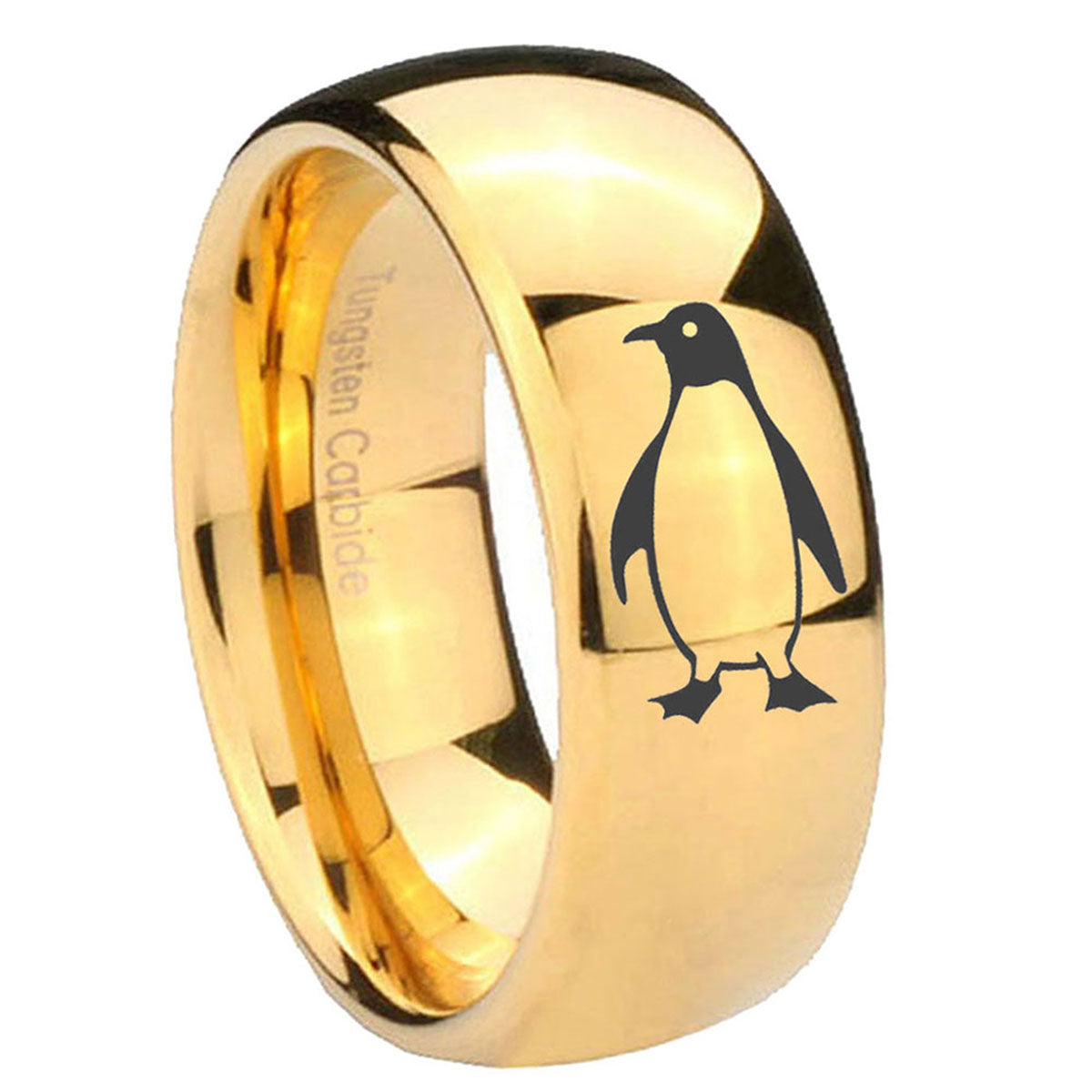 Celebrate with the 10mm Penguin Dome Gold Tungsten Carbide Wedding Band Mens. This gold-finished tungsten ring with Penguin design is perfect for weddings.
