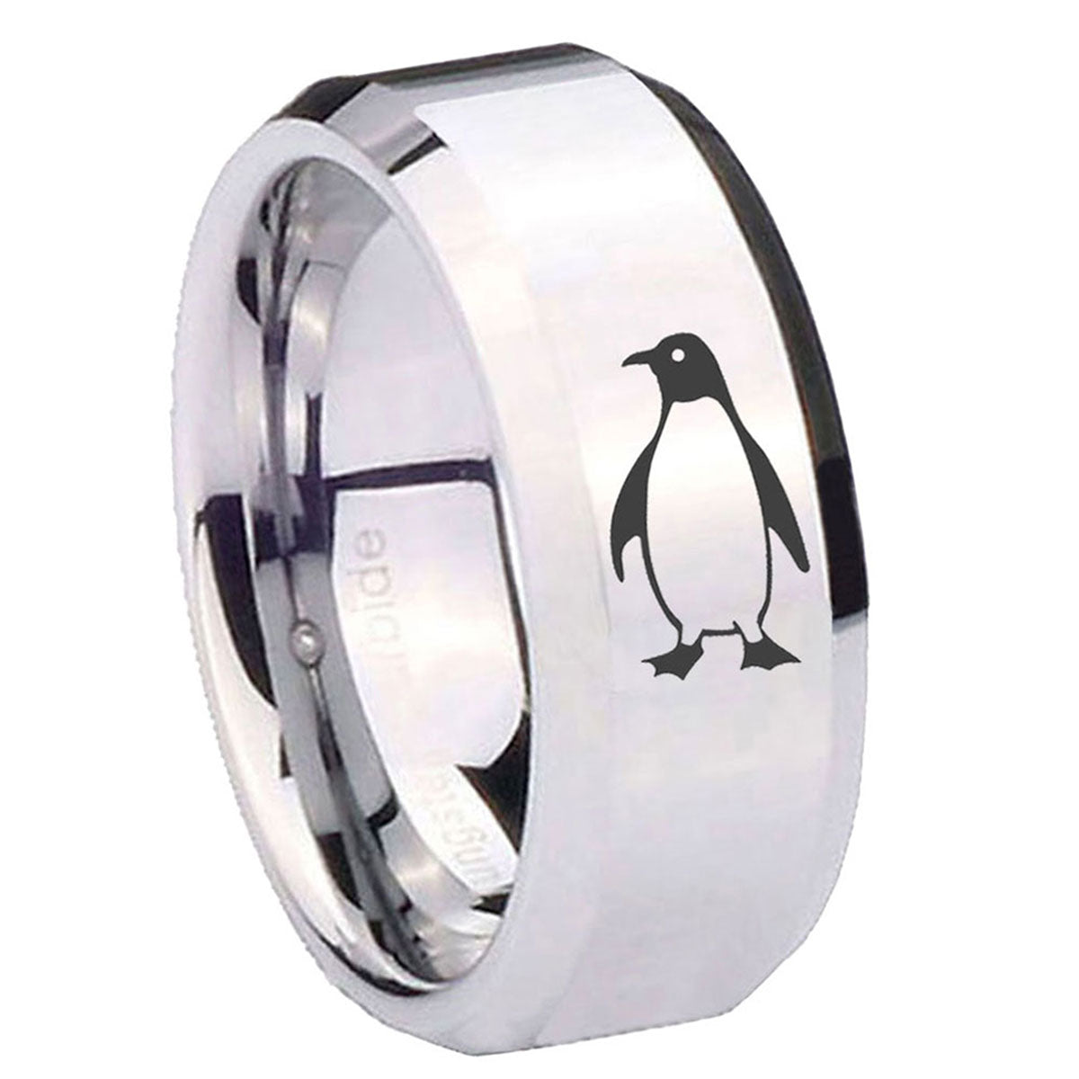 Personalize the 10mm Penguin Beveled Edges Silver Tungsten Carbide Mens Ring Engraved. This silver tungsten ring with Penguin design is perfect for custom engravings.