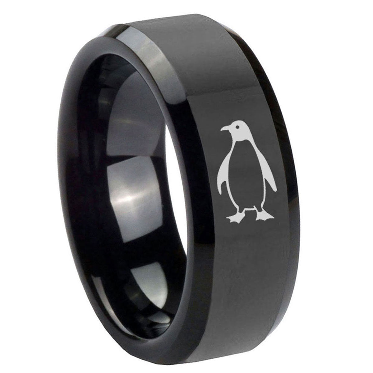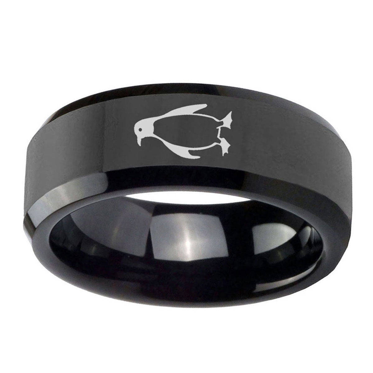 Celebrate with the 10mm Penguin Beveled Edges Black Tungsten Carbide Men's Wedding Band. This black tungsten ring with Penguin design is perfect for weddings.