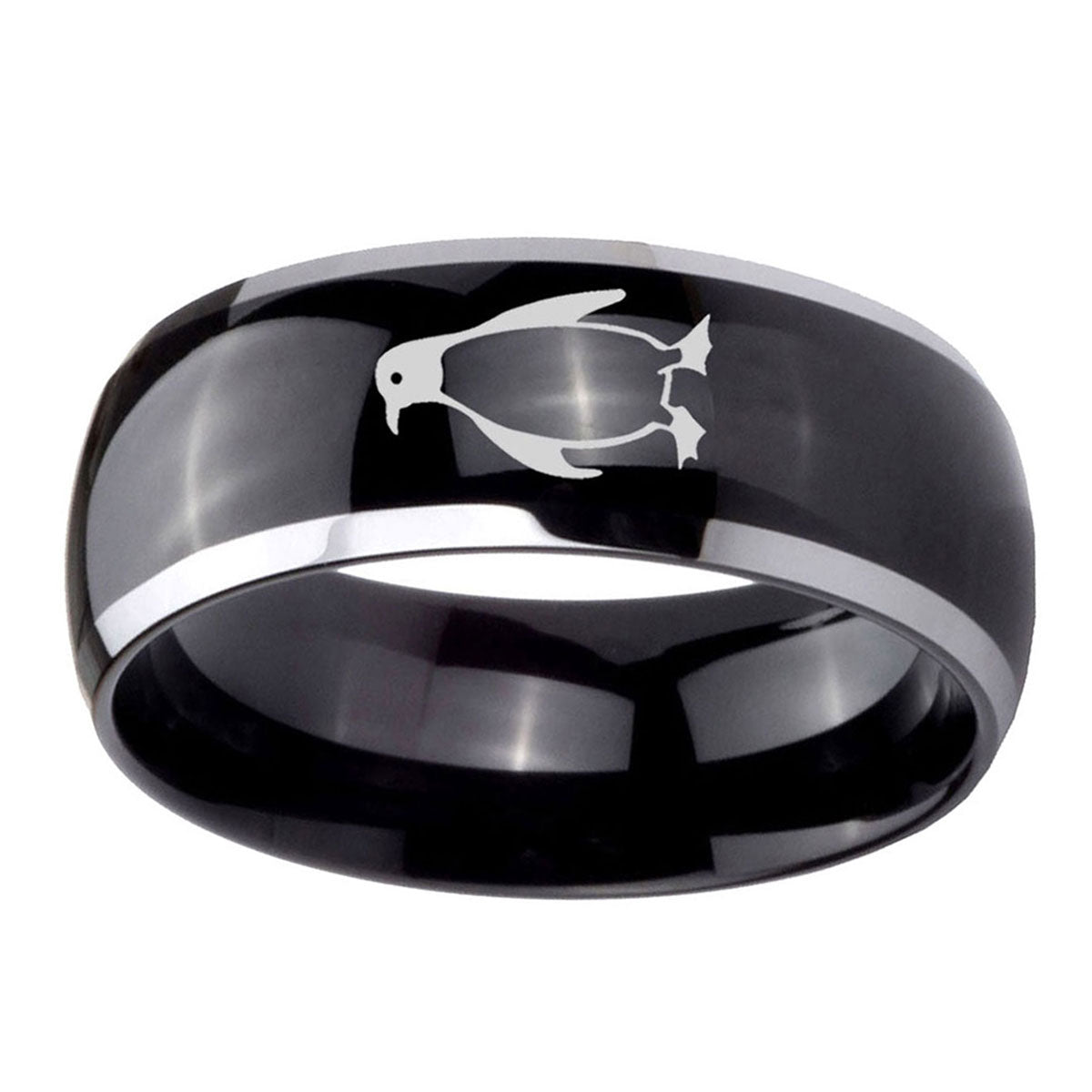 Personalize the 10mm Penguin Dome Glossy Black 2 Tone Tungsten Carbide Engraved Ring. This glossy black and 2-tone dome ring with Penguin design is perfect for custom engravings.