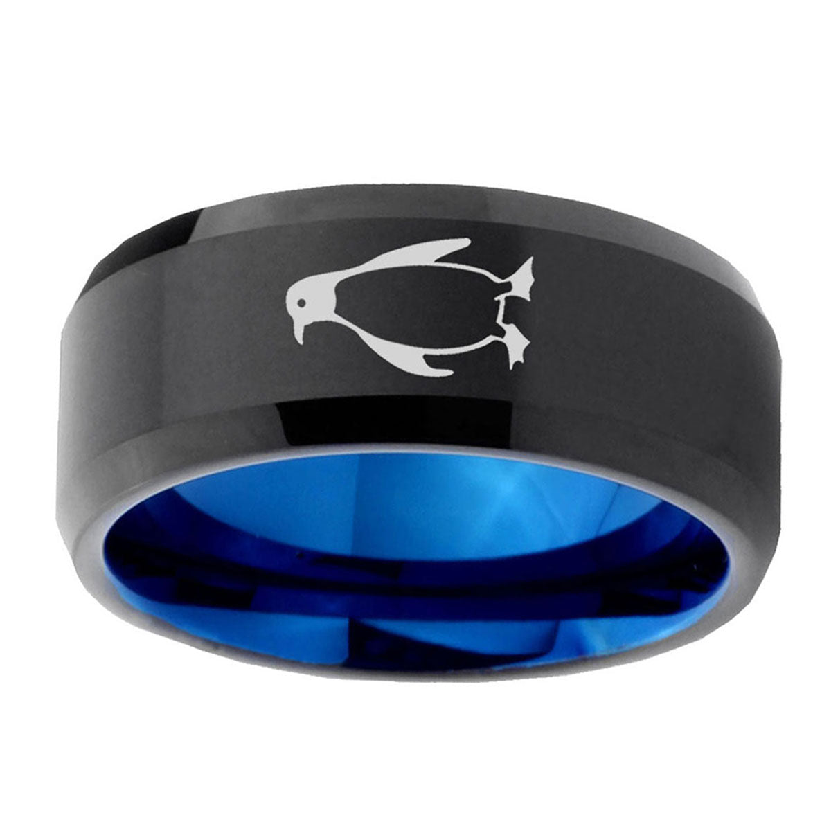 Celebrate with the 10mm Penguin Bevel Tungsten Carbide Blue Wedding Ring. This blue tungsten ring with Penguin design is perfect for weddings.