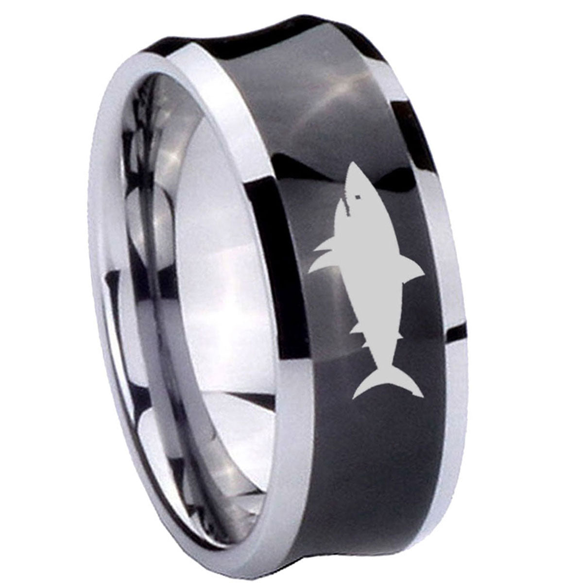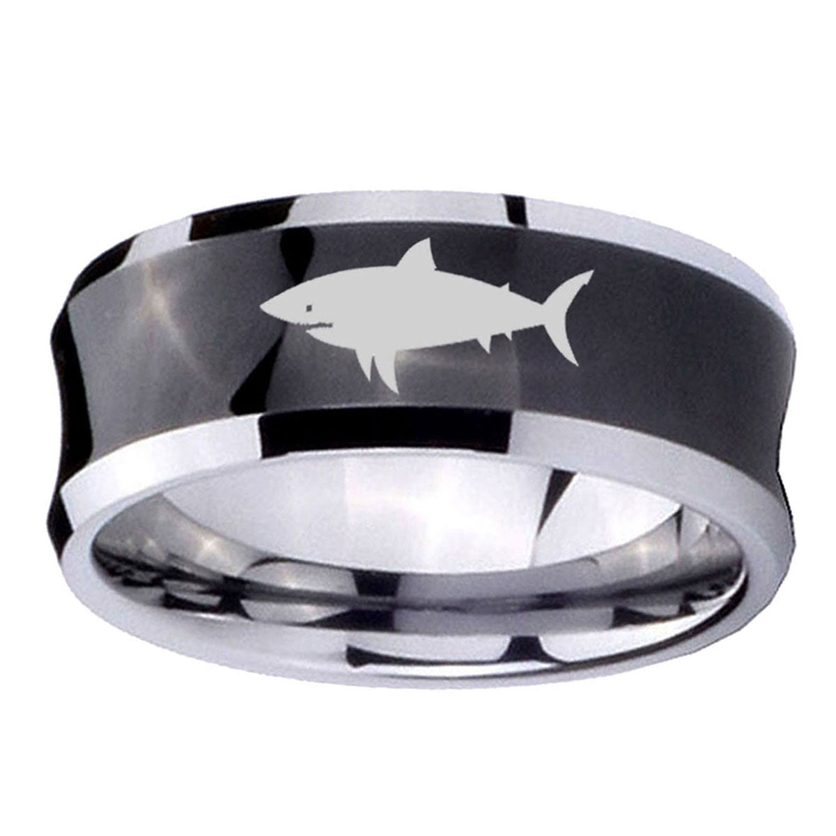 Propose with the 10mm Shark Concave Black Tungsten Carbide Men's Engagement Band. This concave black tungsten ring with Shark design is ideal for engagements.