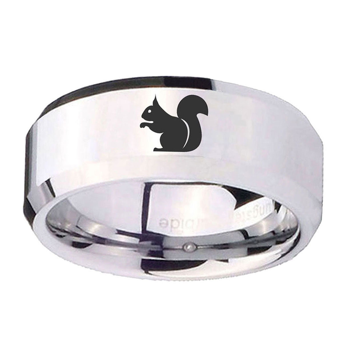 Personalize the 10mm Squirrel Beveled Edges Silver Tungsten Carbide Mens Ring Engraved. This silver tungsten ring with Squirrel design is perfect for custom engravings.