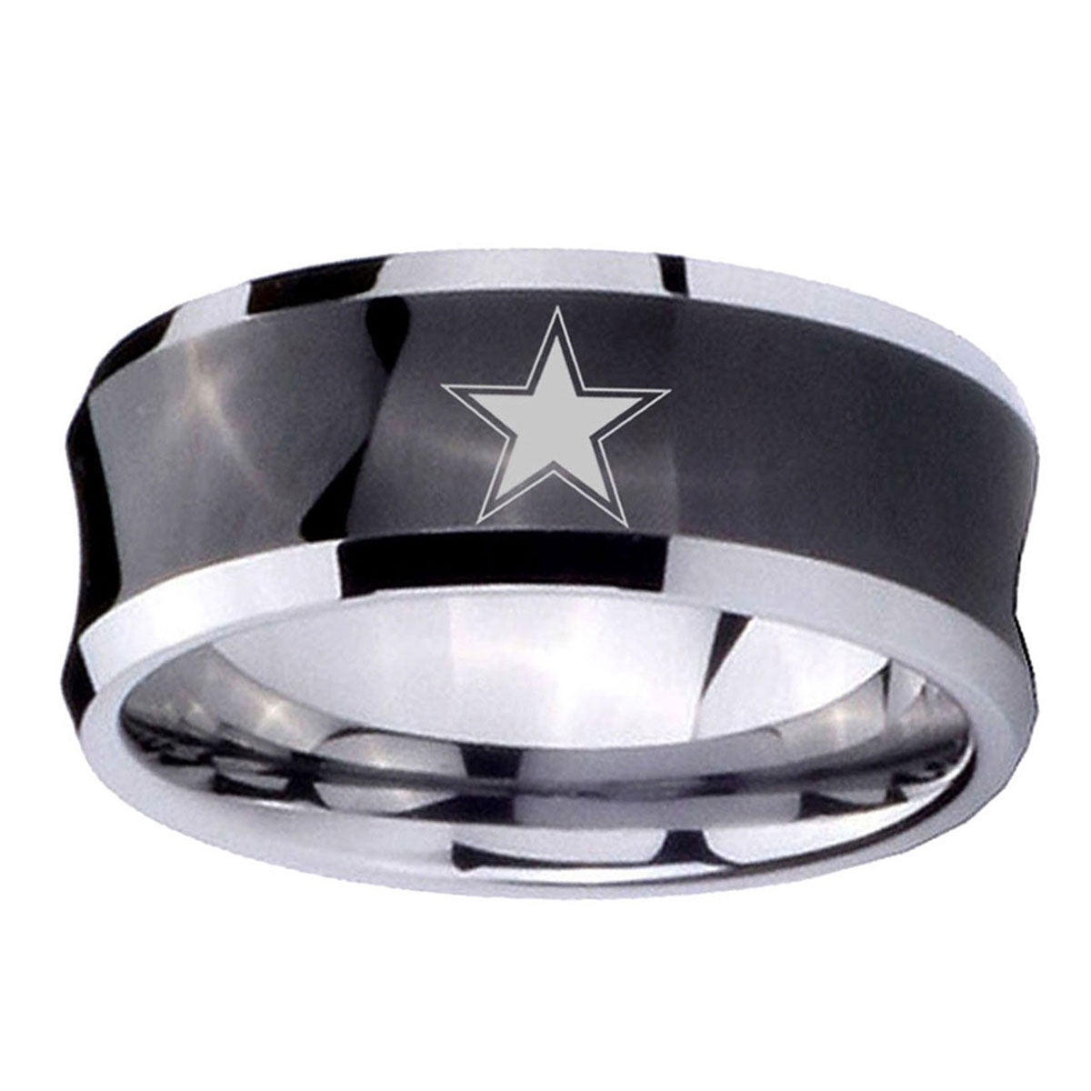 Propose with the 10mm Cowboys Star Concave Black Tungsten Carbide Men's Engagement Band. This concave black tungsten ring with Cowboys Star design is ideal for engagements.